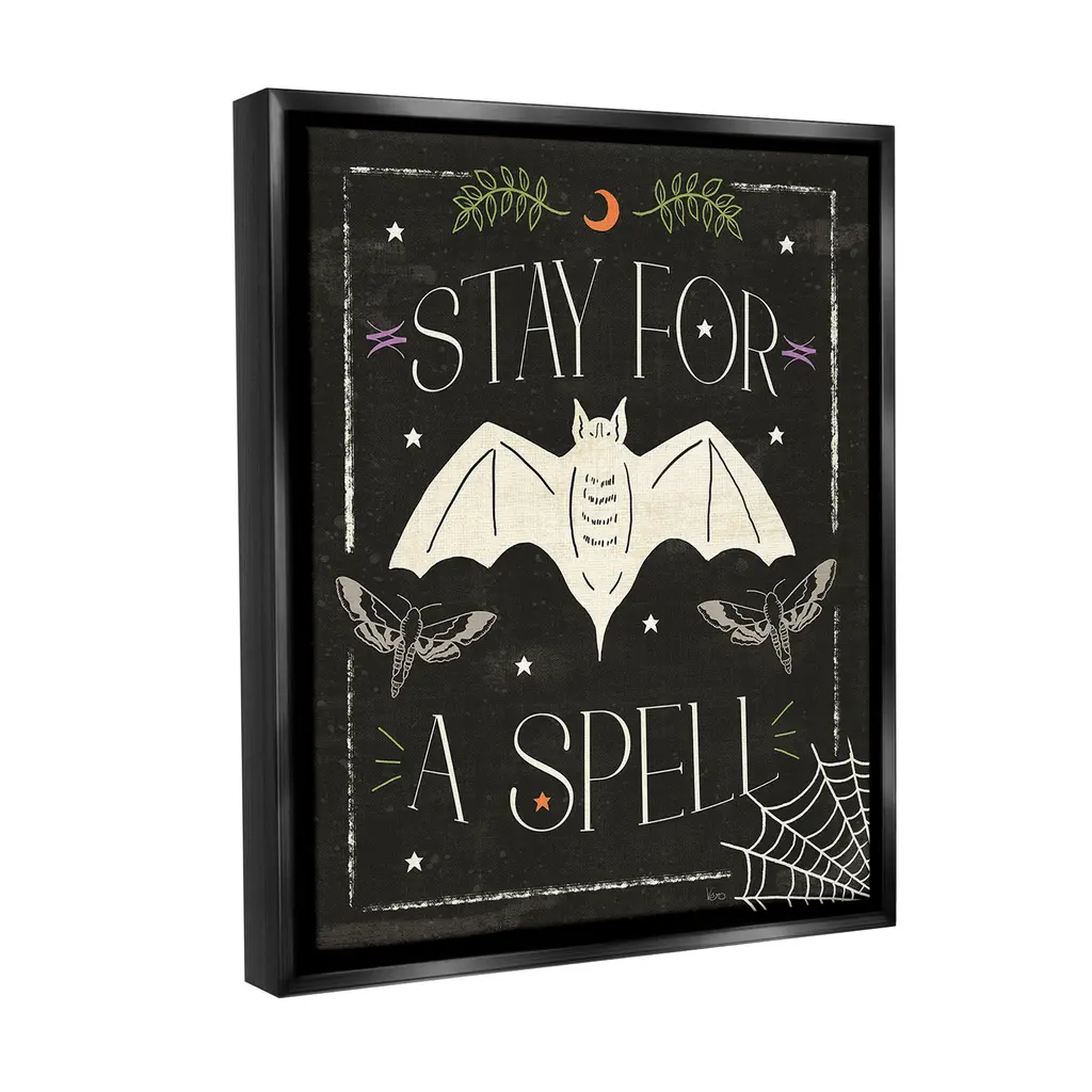 Elevate your home or office to the next level with Stupell Framed Floating Canvas Wall Art. Our premium hand-stretched canvas is mounted securely into a sturdy lightweight frame. The museum-style gap between the wrapped canvas and the box frame gives the illusion of floating artwork. Stupell Wall Art is made in the USA.Features: Dimensions: 17 x 1.7 x 21 Frame, 16 x 1.5 x 20 Canvas ArtFloating Frame Canvas Products are available in sizes 17"x21" and 25"x31". All Floating Frame Canvas Products have a 1.7" Depth.Wall Art is Ready to Hang with Hardware Free Hanging. No Installation required. For Easy Set Up Lean or Layer Artwork on Shelf or Against Wall. Artwork is Permently Fixed into the Frame.Our elevated 1.7" Thick Floating Frame is the perfect complement to our canvas style Wall Art. We use only the highest quality inks in house with industry leading printing solutions. Canvas is hand stretched over a durable wood foundation and then mounted securly into a Modern Box Frame. Made in the USA.Artwork Relates To: Festival, Halloween, Botanical, Leaf, Moon, Bat, Spider, Stars, Web, Moth, Stay For a SpellDesign by Veronique Charron