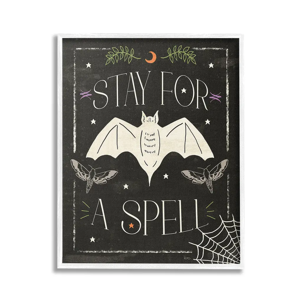 Add dimension to any room with our textured Framed Giclee Artwork. Our framed artwork is securely mounted into a 1.5-inch thick wood grain frame and ready to hang. Frames are available in three alluring styles: black, gray farmhouse and white. In addition, you should check out our oversized options if you want a statement piece. Stupell Wall Art is made in the USA.Features: Dimensions: 11 x 1.5 x 14 FramedFramed Giclee Products are available in the sizes 11"x14", 16"x20" or 24"x30". All Framed Giclee Products have a 1.5" Depth. Wall Art is Ready to Hang with Hardware Free Hanging. No installation required. For Easy Set Up Lean or Layer Artwork on Shelf or Against Wall.Our giclée prints are carefully mounted on a durable MDF backing, and then perfectly finished in a 1.5 inch thick woodgrain frame. Mounted frame colors include black, gray farmhouse and white. Made In USA.Artwork Relates To: Festival, Halloween, Botanical, Leaf, Moon, Bat, Spider, Stars, Web, Moth, Stay For a SpellDesign by Veronique Charron