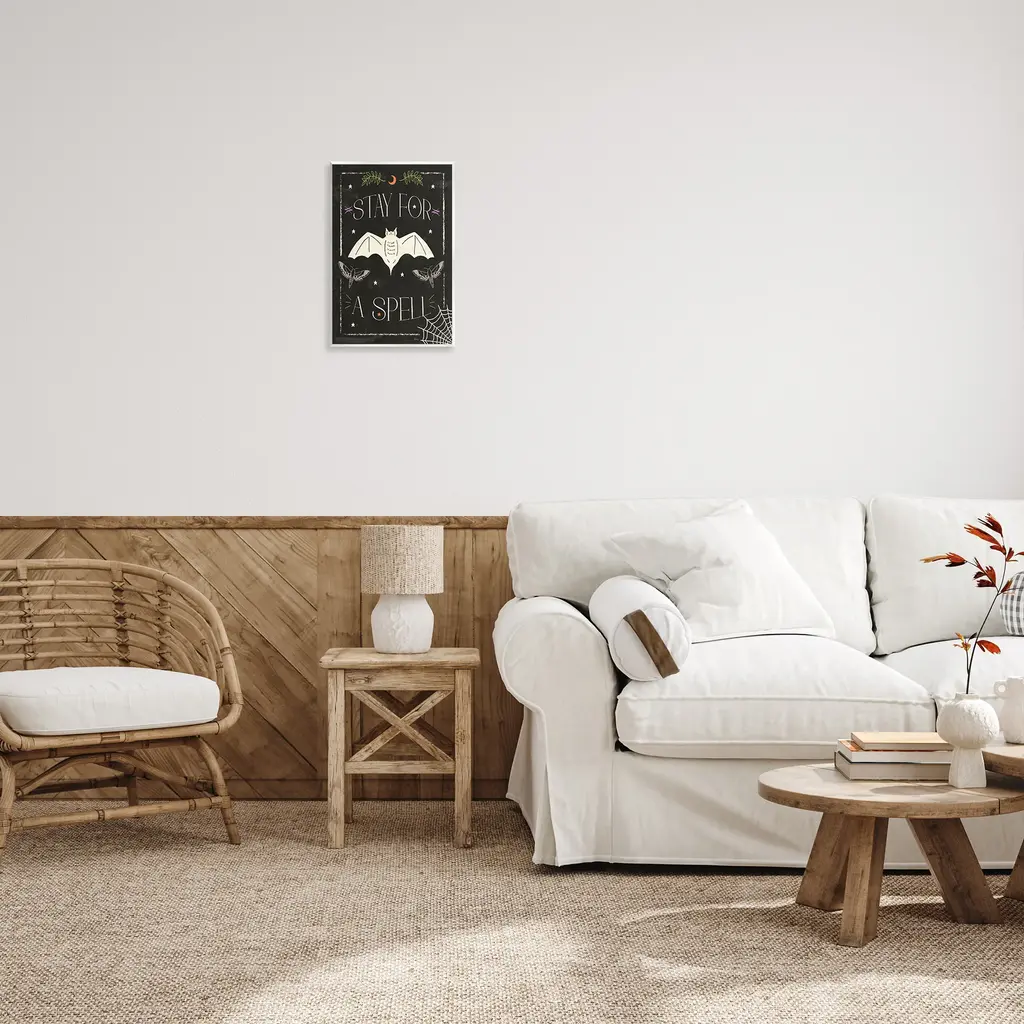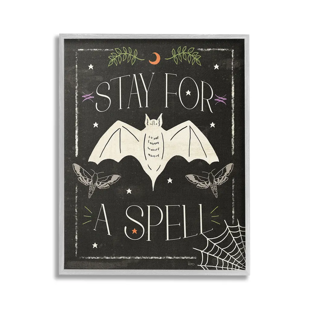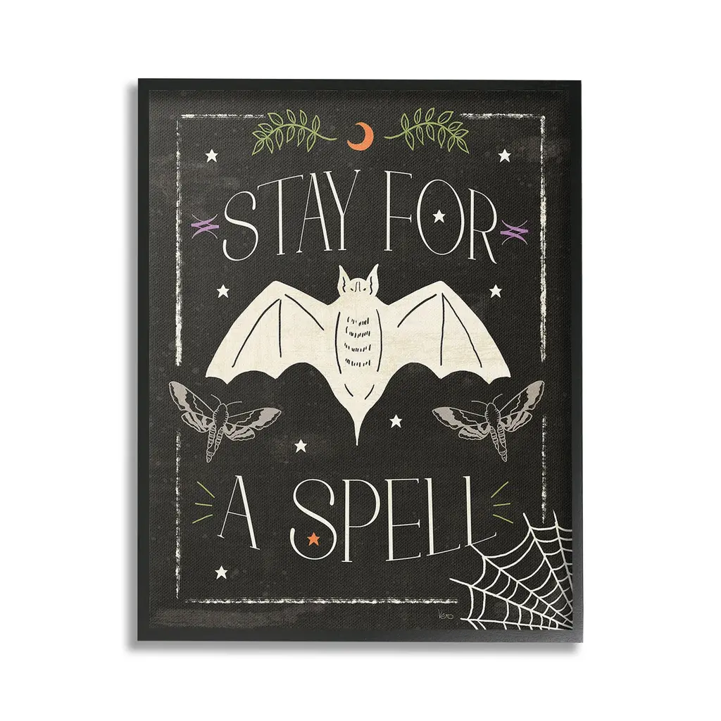 Our wall plaques start as high-quality lithograph prints mounted on durable 0.5-inch thick MDF wood. Each piece is hand finished and comes with a fresh layer of white foil on the sides to give it a crisp, clean look. Plaques arrive ready to hang without installation and come with removable plastic corners to keep them from damage in transit. Stupell Wall Art is made in the USA.Features: Dimensions: 10 x 0.5 x 15 InchesWall Plaque Product Sizes Include 10"x15" and 13"x19". All wall plaque products have a 0.5" Depth. Wall Art is Ready to Hang with Hardware Free Hanging. No installation required. For Easy Set Up Lean or Layer Artwork on Shelf or Against Wall.All of our wall plaques start off as high quality lithograph prints that are then mounted on durable 0.5 inch thick MDF wood. Each piece is hand finished and comes with a fresh layer of foil on the sides to give it a crisp clean look. Made In USA.Artwork Relates To: Festival, Halloween, Botanical, Leaf, Moon, Bat, Spider, Stars, Web, Moth, Stay For a SpellDesign by Veronique Charron