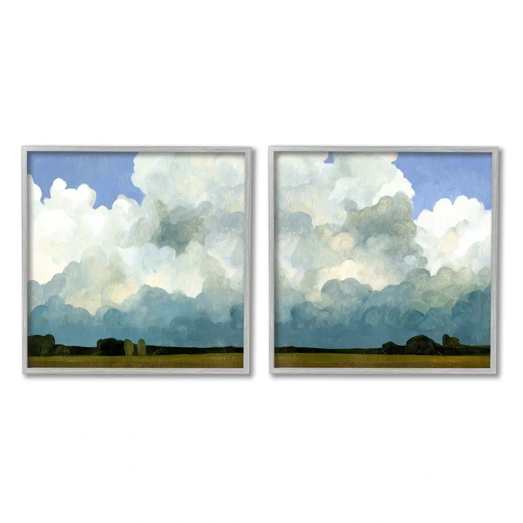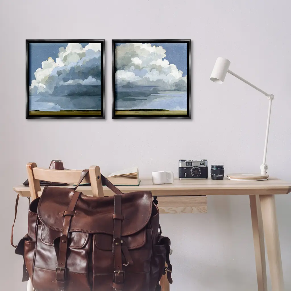 Elevate your home or office to the next level with Stupell Framed Floating Canvas Wall Art. Our premium hand-stretched canvas is mounted securely into a sturdy lightweight frame. The museum-style gap between the wrapped canvas and the box frame gives the illusion of floating artwork. Stupell Wall Art is made in the USA.Features: Dimensions: 2 Piece Set, Each Frame is 18 x 1.7 x 18Two Piece Floating Frame Canvas Products are available as 18"x18" or 25"x25" Panels. All Floating Frame Canvas Products have a 1.7" Depth.Wall Art is Ready to Hang with Hardware Free Hanging. No Installation required. For Easy Set Up Lean or Layer Artwork on Shelf or Against Wall. Artwork is Permently Fixed into the Frame.Our elevated 1.7" Thick Floating Frame is the perfect complement to our canvas style Wall Art. We use only the highest quality inks in house with industry leading printing solutions. Canvas is hand stretched over a durable wood foundation and then mounted securly into a Modern Box Frame. Made in the USA.Artwork Relates To: Nature, Weather, Sky, Cumulus, CloudDesign by Emma Caroline
