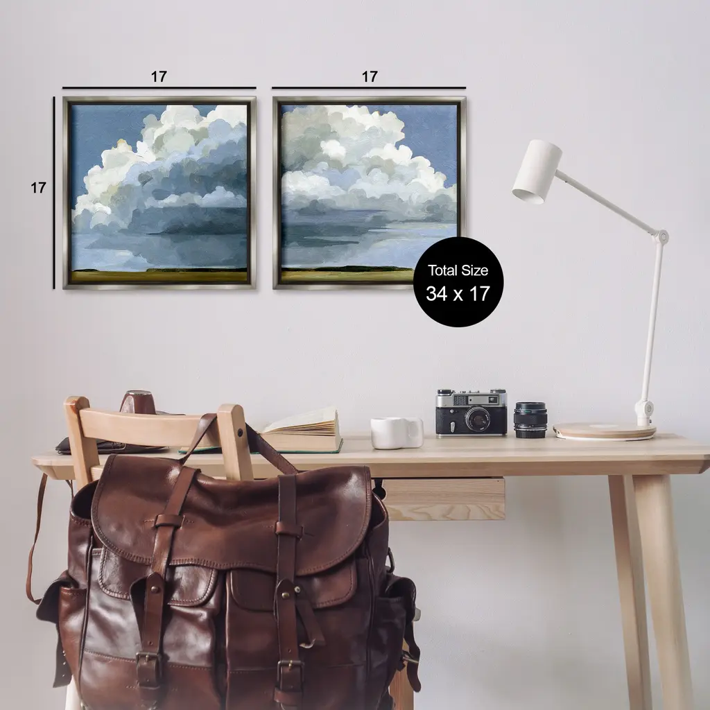 Elevate your home or office to the next level with Stupell Framed Floating Canvas Wall Art. Our premium hand-stretched canvas is mounted securely into a sturdy lightweight frame. The museum-style gap between the wrapped canvas and the box frame gives the illusion of floating artwork. Stupell Wall Art is made in the USA.Features: Dimensions: 2 Piece Set, Each Frame is 18 x 1.7 x 18Two Piece Floating Frame Canvas Products are available as 18"x18" or 25"x25" Panels. All Floating Frame Canvas Products have a 1.7" Depth.Wall Art is Ready to Hang with Hardware Free Hanging. No Installation required. For Easy Set Up Lean or Layer Artwork on Shelf or Against Wall. Artwork is Permently Fixed into the Frame.Our elevated 1.7" Thick Floating Frame is the perfect complement to our canvas style Wall Art. We use only the highest quality inks in house with industry leading printing solutions. Canvas is hand stretched over a durable wood foundation and then mounted securly into a Modern Box Frame. Made in the USA.Artwork Relates To: Nature, Weather, Sky, Cumulus, CloudDesign by Emma Caroline