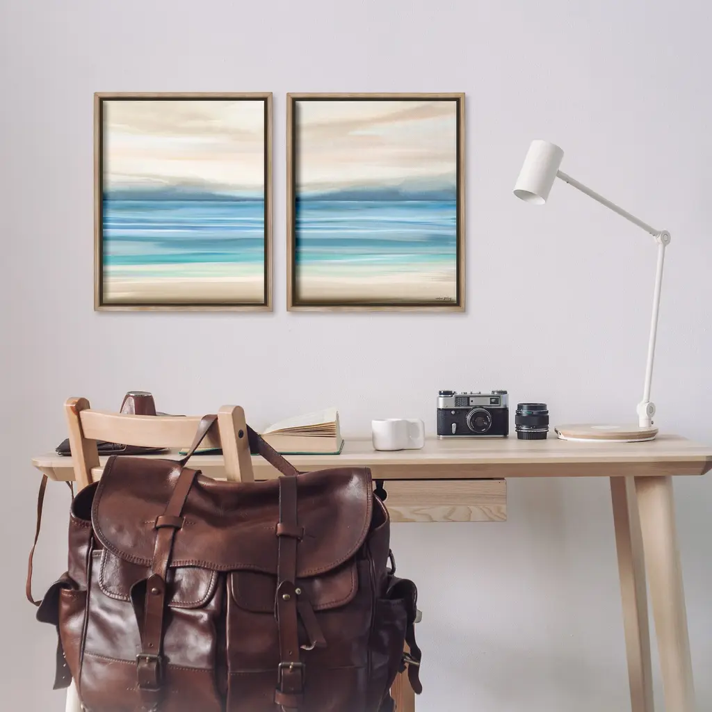 Elevate your home or office to the next level with Stupell Framed Floating Canvas Wall Art. Our premium hand-stretched canvas is mounted securely into a sturdy lightweight frame. The museum-style gap between the wrapped canvas and the box frame gives the illusion of floating artwork. Stupell Wall Art is made in the USA.Features: Dimensions: 2 Piece Set, Each Frame is 17 x 1.7 x 21Two Piece Floater Framed Canvas are available as 17x21 or 25x31 Panels. All Floater Frame Products have a 1.7" Depth.Wall Art is Ready to Hang with Hardware Free Hanging. No Installation required. For Easy Set Up Lean or Layer Artwork on Shelf or Against Wall. Artwork is Permently Fixed into the Frame.Our elevated 1.7" Thick Floating Frame is the perfect complement to our canvas style Wall Art. We use only the highest quality inks in house with industry leading printing solutions. Canvas is hand stretched over a durable wood foundation and then mounted securly into a Modern Box Frame. Made in the USA.Artwork Relates To: Abstract, Landscape, Ocean, Beach, Sea, Coast, HorizonDesign by Amber Sterling