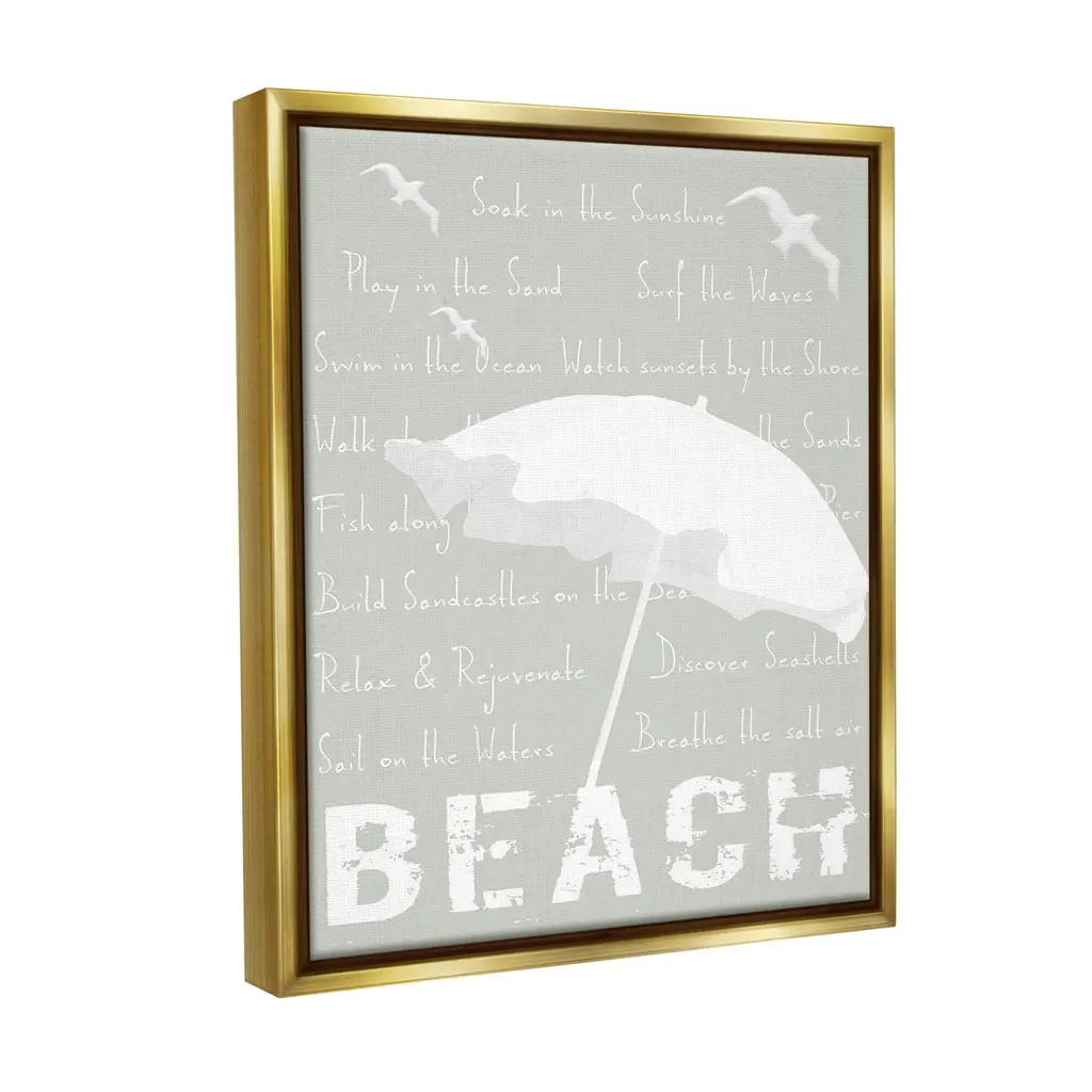 Elevate your home or office to the next level with Stupell Framed Floating Canvas Wall Art. Our premium hand-stretched canvas is mounted securely into a sturdy lightweight frame. The museum-style gap between the wrapped canvas and the box frame gives the illusion of floating artwork. Stupell Wall Art is made in the USA.Features: Dimensions: 17 x 1.7 x 21 Frame, 16 x 1.5 x 20 Canvas ArtFloating Frame Canvas Products are available in sizes 17"x21" and 25"x31". All Floating Frame Canvas Products have a 1.7" Depth.Wall Art is Ready to Hang with Hardware Free Hanging. No Installation required. For Easy Set Up Lean or Layer Artwork on Shelf or Against Wall. Artwork is Permently Fixed into the Frame.Our elevated 1.7" Thick Floating Frame is the perfect complement to our canvas style Wall Art. We use only the highest quality inks in house with industry leading printing solutions. Canvas is hand stretched over a durable wood foundation and then mounted securly into a Modern Box Frame. Made in the USA.Artwork Relates To: Beach, Nautical, Animal, Seagull, Umbrella, Phrase, Rules, Summer, ActivitiesDesign by GraffiTee Studios