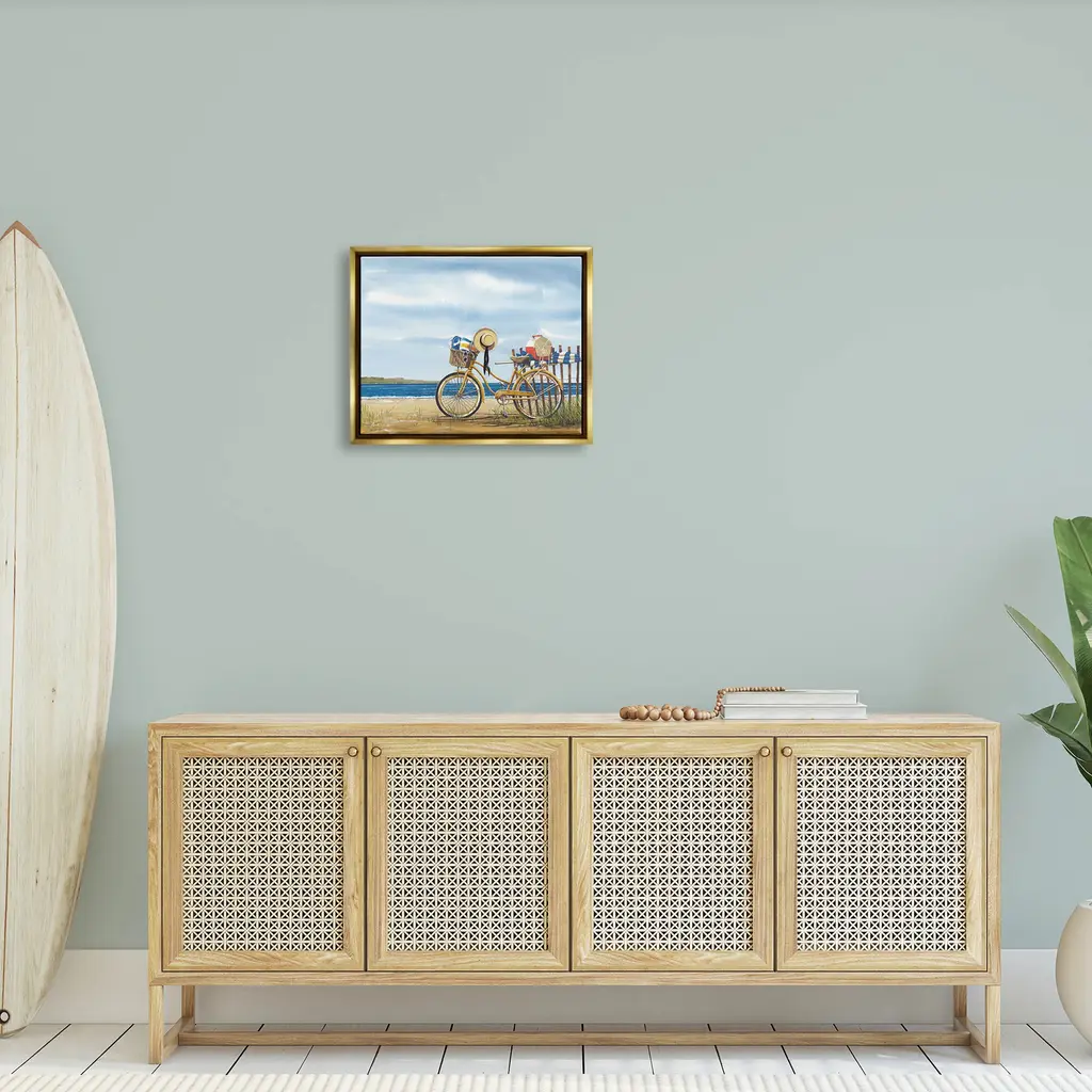 Elevate your home or office to the next level with Stupell Framed Floating Canvas Wall Art. Our premium hand stretched canvas is mounted securly into a sturdy lightweight frame. The museum style gap between wrapped canvas and box frame gives the illusion of floating artwork. Features: Dimensions: 21 x 1.7 x 17 Frame, 20 x 1.5 x 16 Canvas ArtFloating Frame Sizes Include Standard: 21 x 1.7 x 17 Oversized: 31 x 1.7 x 25Wall Art is Ready to Hang - No Installation or Hardware Needed. For Easy Set Up Lean or Layer Artwork on Shelf or Against Wall.Our elevated 1.7" Thick Floating Frame is the perfect complement to our canvas style Wall Art. We use only the highest quality inks in house with industry leading printing solutions. Canvas is hand stretched over a durable wood foundation and then mounted securly into a Modern Box Frame. Made in the USA.Artwork Relates To: Summer, Beach, Sea, Shoreline, Coast, Water, Outdoors, Nature, BicycleDesign by John Rossini