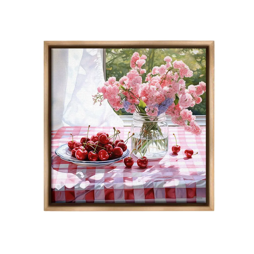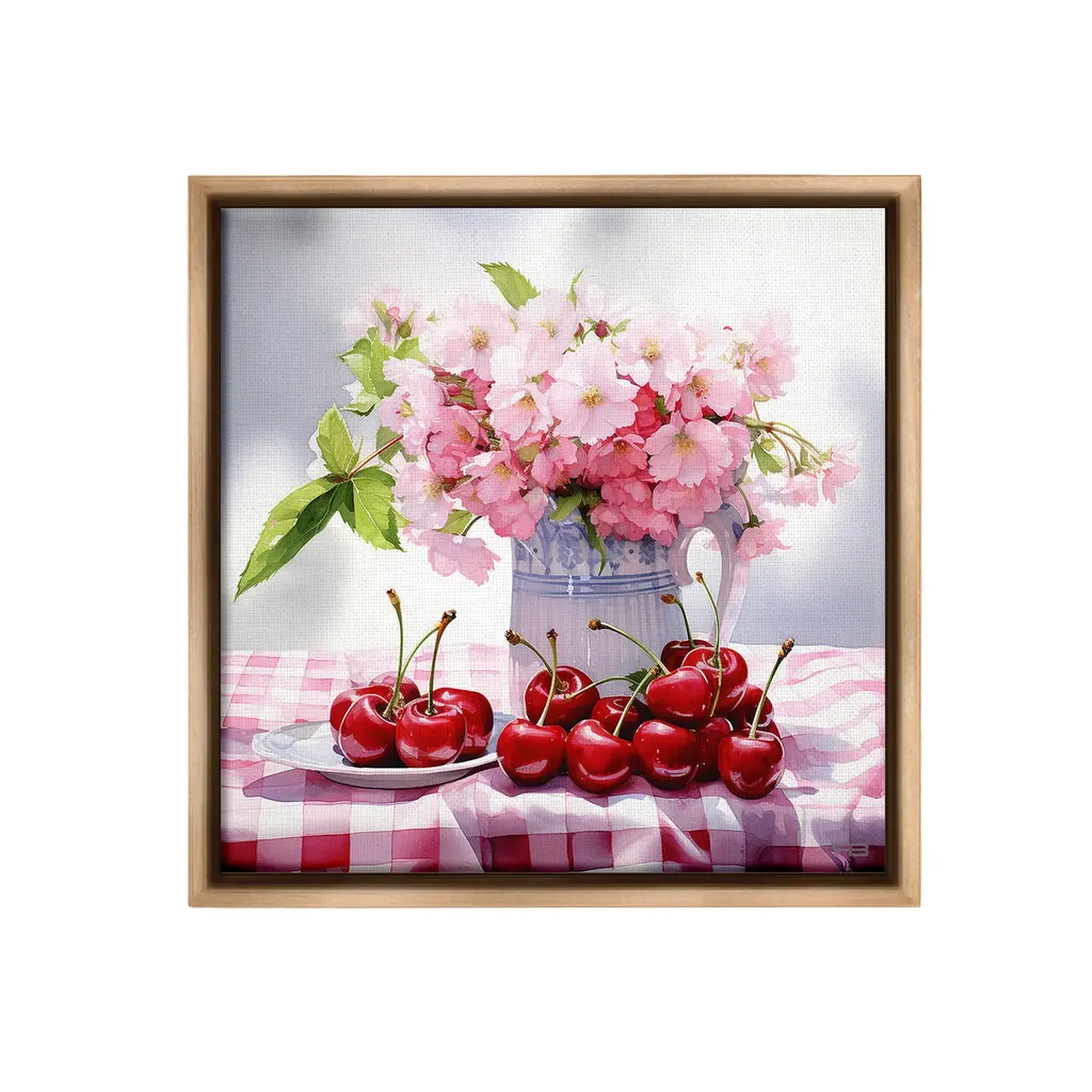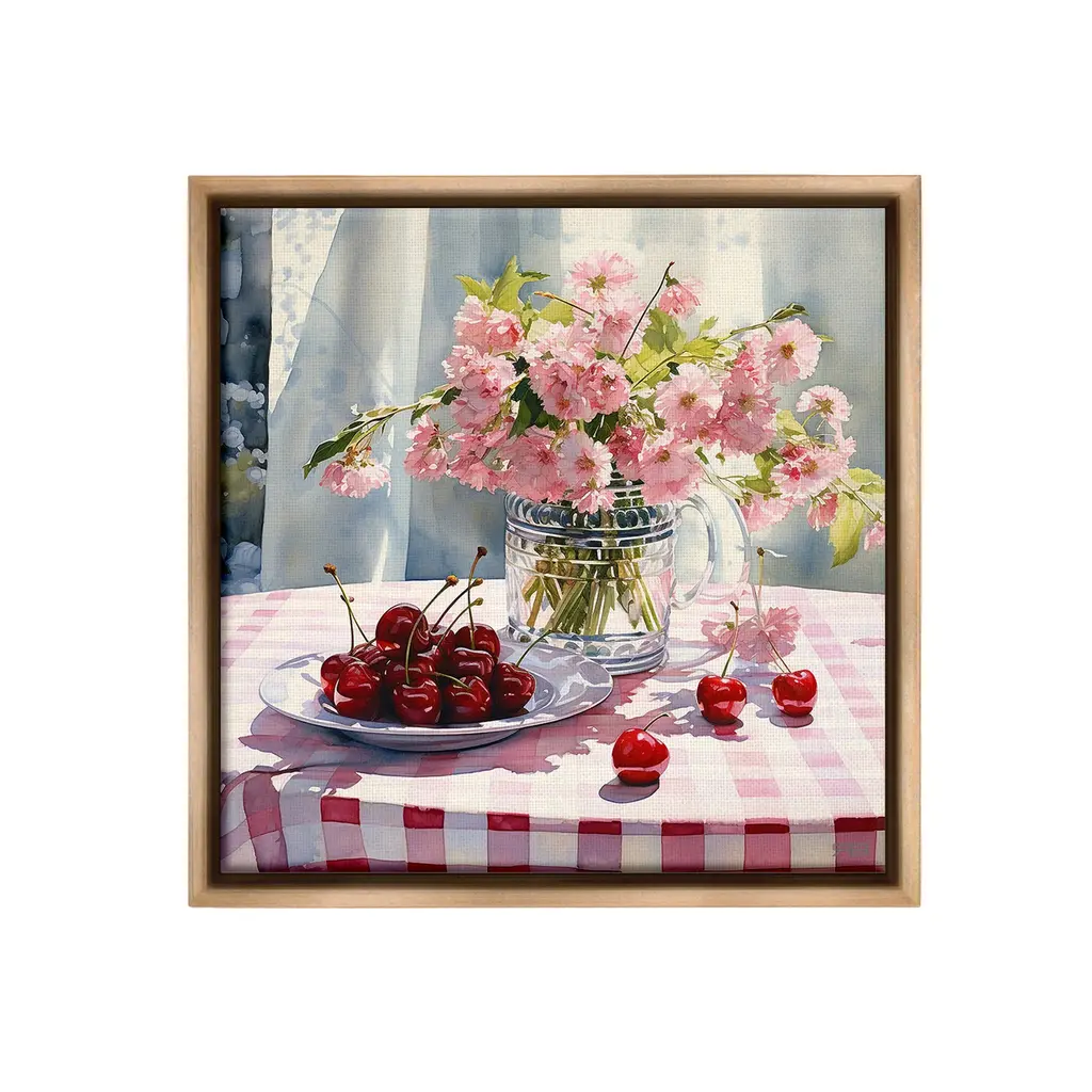 Elevate your home or office to the next level with Stupell Framed Floating Canvas Wall Art. Our premium hand-stretched canvas is mounted securely into a sturdy lightweight frame. The museum-style gap between the wrapped canvas and the box frame gives the illusion of floating artwork. Stupell Wall Art is made in the USA.Features: Dimensions: 18 x 1.7 x 18 Frame, 17 x 1.5 x 17 Canvas ArtFloating Frame Canvas Products are available in sizes 18"x18" and 25"x25". All Floating Frame Canvas Products have a 1.7" Depth.Wall Art is Ready to Hang with Hardware Free Hanging. No Installation required. For Easy Set Up Lean or Layer Artwork on Shelf or Against Wall. Artwork is Permently Fixed into the Frame.Our elevated 1.7" Thick Floating Frame is the perfect complement to our canvas style Wall Art. We use only the highest quality inks in house with industry leading printing solutions. Canvas is hand stretched over a durable wood foundation and then mounted securly into a Modern Box Frame. Made in the USA.Artwork Relates To: Food, Fruit, Plant, Produce, Flower, Cherry, Bouquet, Pink, Summer, Spring, Gingham, PatternDesign by RB