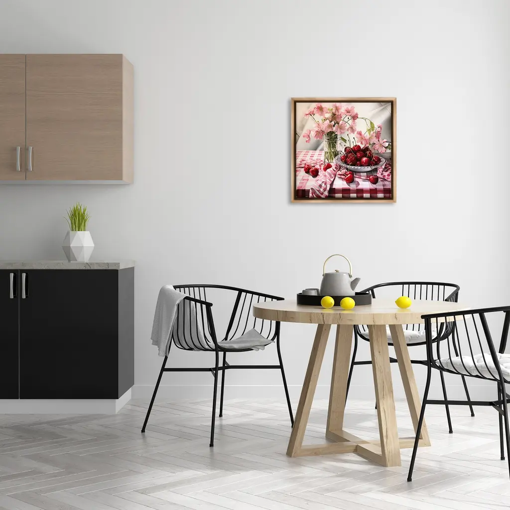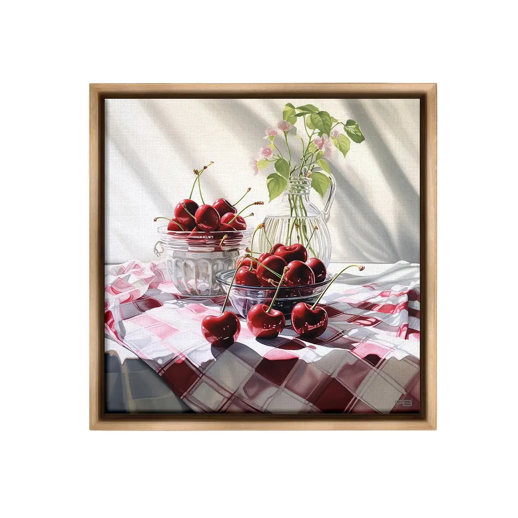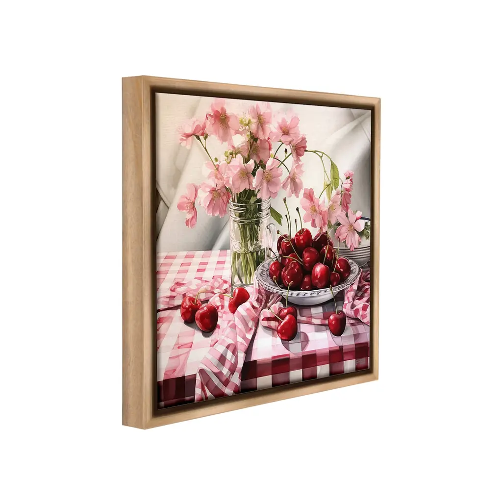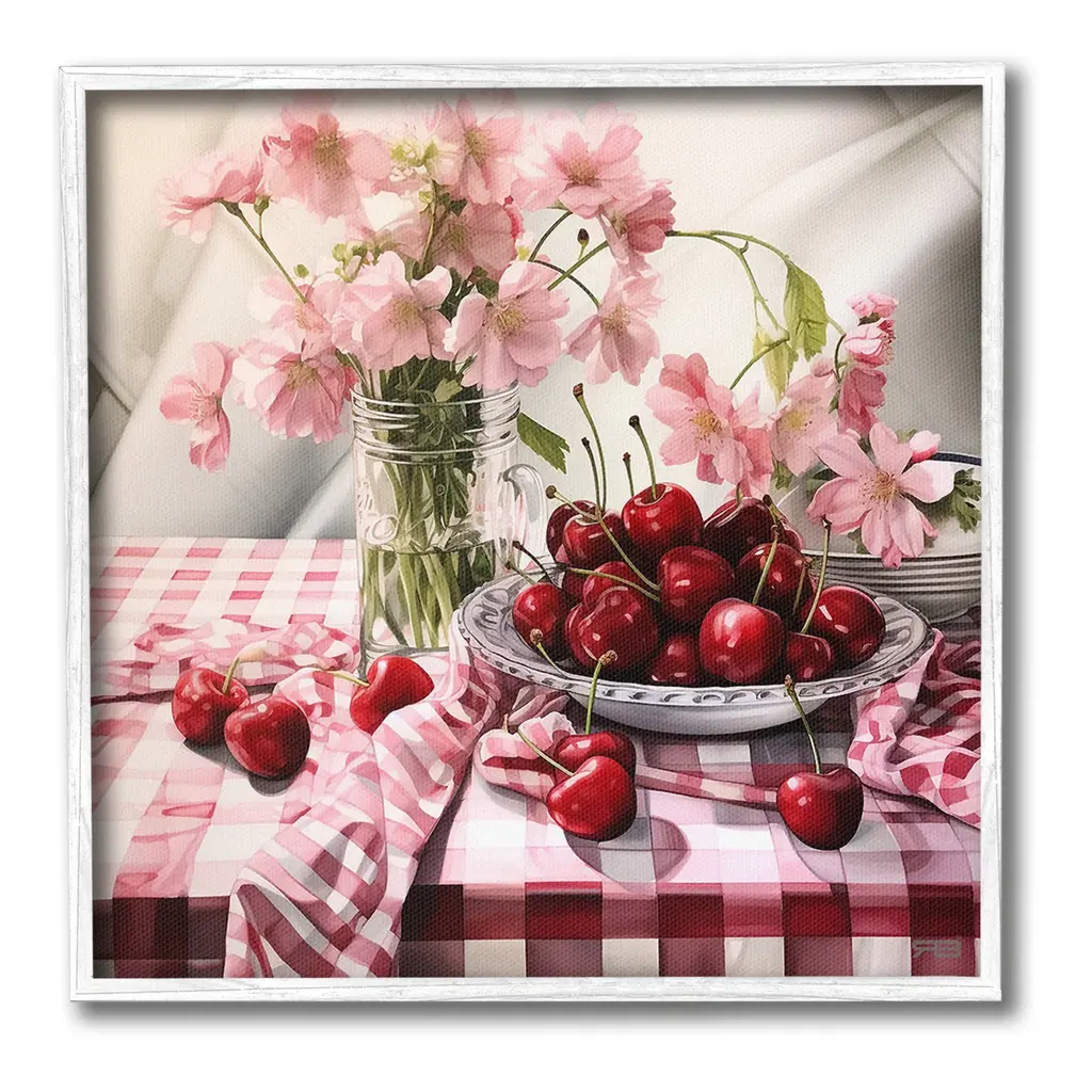 Elevate your home or office to the next level with Stupell Framed Floating Canvas Wall Art. Our premium hand-stretched canvas is mounted securely into a sturdy lightweight frame. The museum-style gap between the wrapped canvas and the box frame gives the illusion of floating artwork. Stupell Wall Art is made in the USA.Features: Dimensions: 18 x 1.7 x 18 Frame, 17 x 1.5 x 17 Canvas ArtFloating Frame Canvas Products are available in sizes 18"x18" and 25"x25". All Floating Frame Canvas Products have a 1.7" Depth.Wall Art is Ready to Hang with Hardware Free Hanging. No Installation required. For Easy Set Up Lean or Layer Artwork on Shelf or Against Wall. Artwork is Permently Fixed into the Frame.Our elevated 1.7" Thick Floating Frame is the perfect complement to our canvas style Wall Art. We use only the highest quality inks in house with industry leading printing solutions. Canvas is hand stretched over a durable wood foundation and then mounted securly into a Modern Box Frame. Made in the USA.Artwork Relates To: Food, Fruit, Plant, Produce, Flower, Cherry, Bouquet, Pink, Summer, Spring, Gingham, PatternDesign by RB