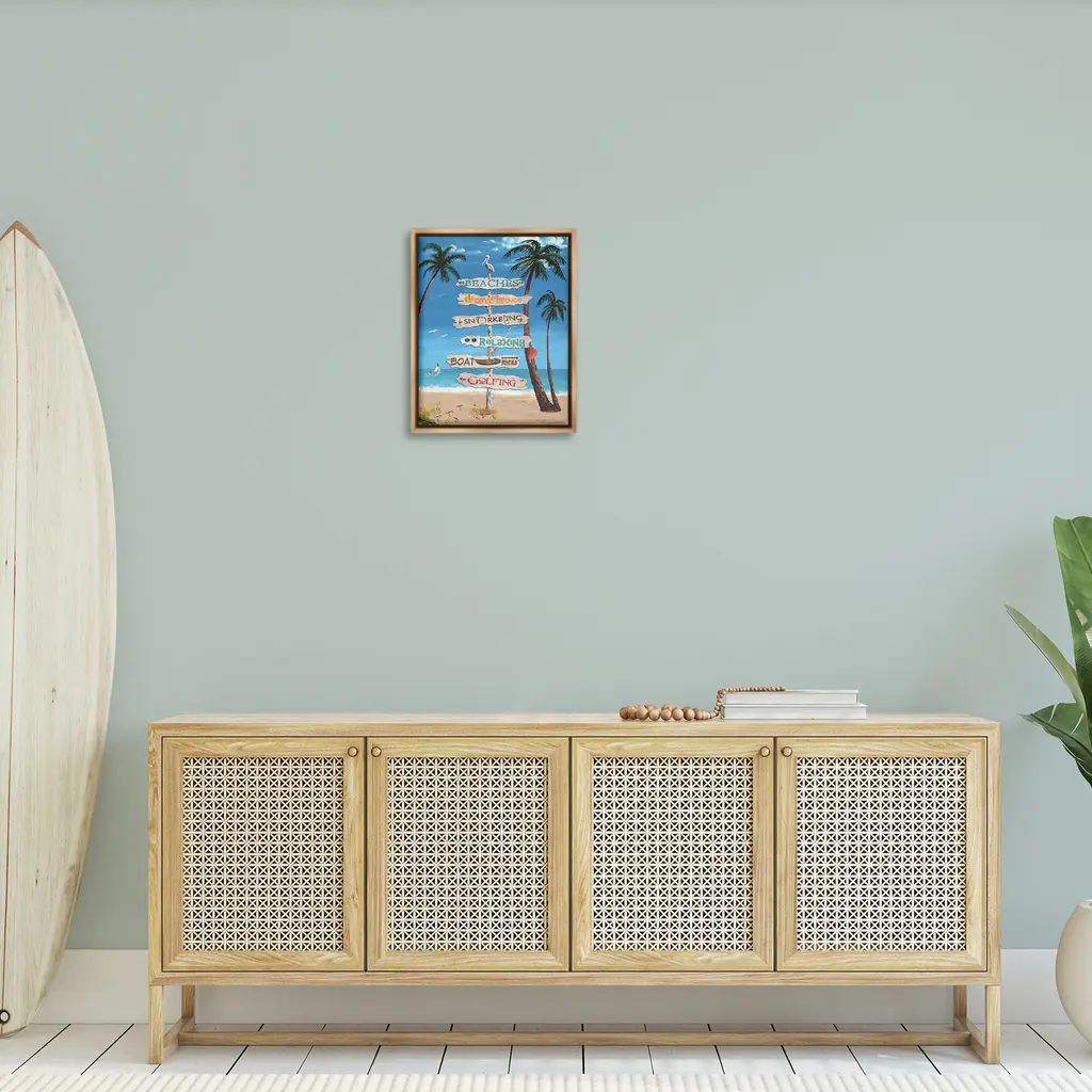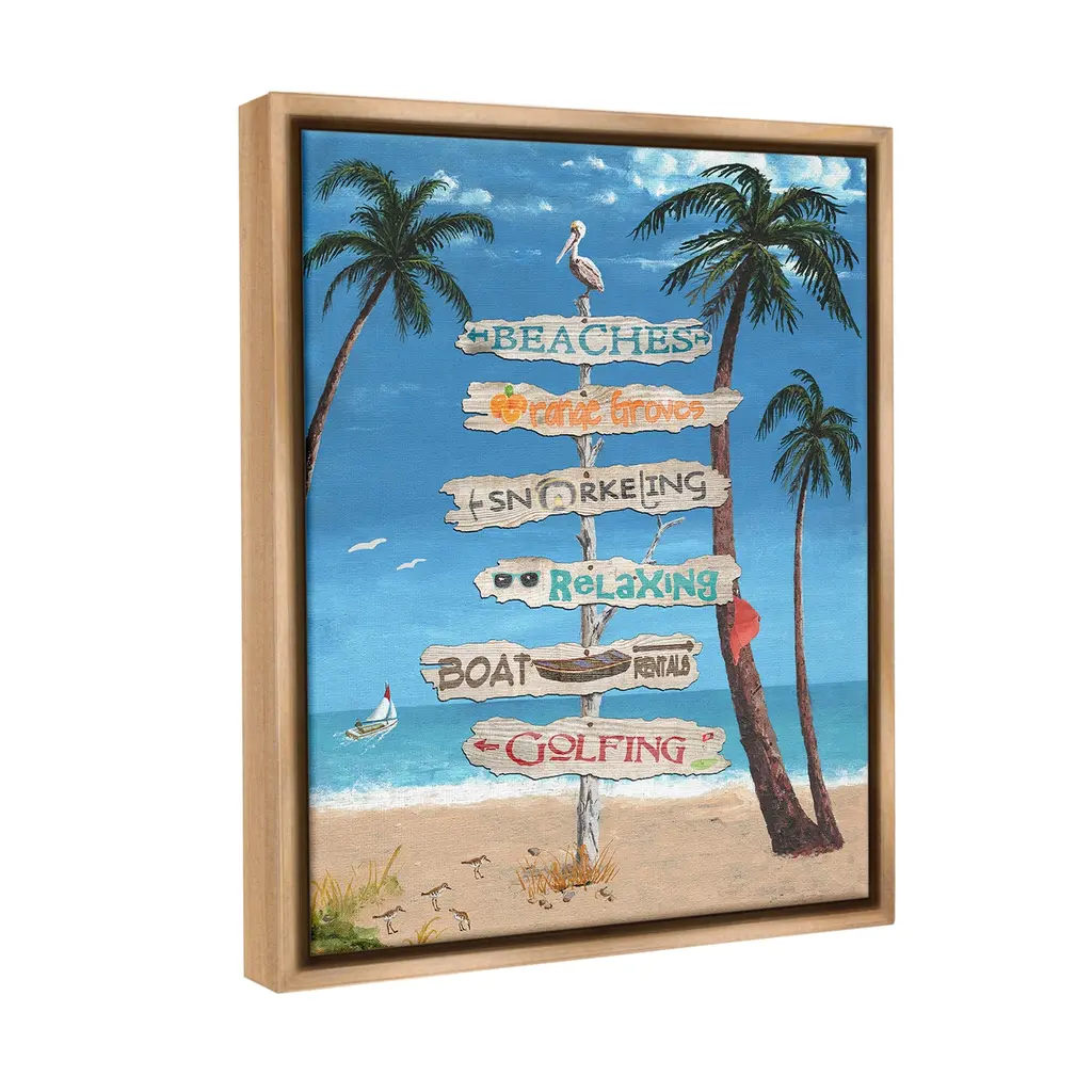 Elevate your home or office to the next level with Stupell Framed Floating Canvas Wall Art. Our premium hand-stretched canvas is mounted securely into a sturdy lightweight frame. The museum-style gap between the wrapped canvas and the box frame gives the illusion of floating artwork. Stupell Wall Art is made in the USA.Features: Dimensions: 17 x 1.7 x 21 Frame, 16 x 1.5 x 20 Canvas ArtFloating Frame Canvas Products are available in sizes 17"x21" and 25"x31". All Floating Frame Canvas Products have a 1.7" Depth.Wall Art is Ready to Hang with Hardware Free Hanging. No Installation required. For Easy Set Up Lean or Layer Artwork on Shelf or Against Wall. Artwork is Permently Fixed into the Frame.Our elevated 1.7" Thick Floating Frame is the perfect complement to our canvas style Wall Art. We use only the highest quality inks in house with industry leading printing solutions. Canvas is hand stretched over a durable wood foundation and then mounted securly into a Modern Box Frame. Made in the USA.Artwork Relates To: Summer, Scenery, Sea, Water, Shoreline, Beach, Coast, Shore, Palm Tree, Sign, Seagull, Sandpiper, BirdDesign by Gail Fraser