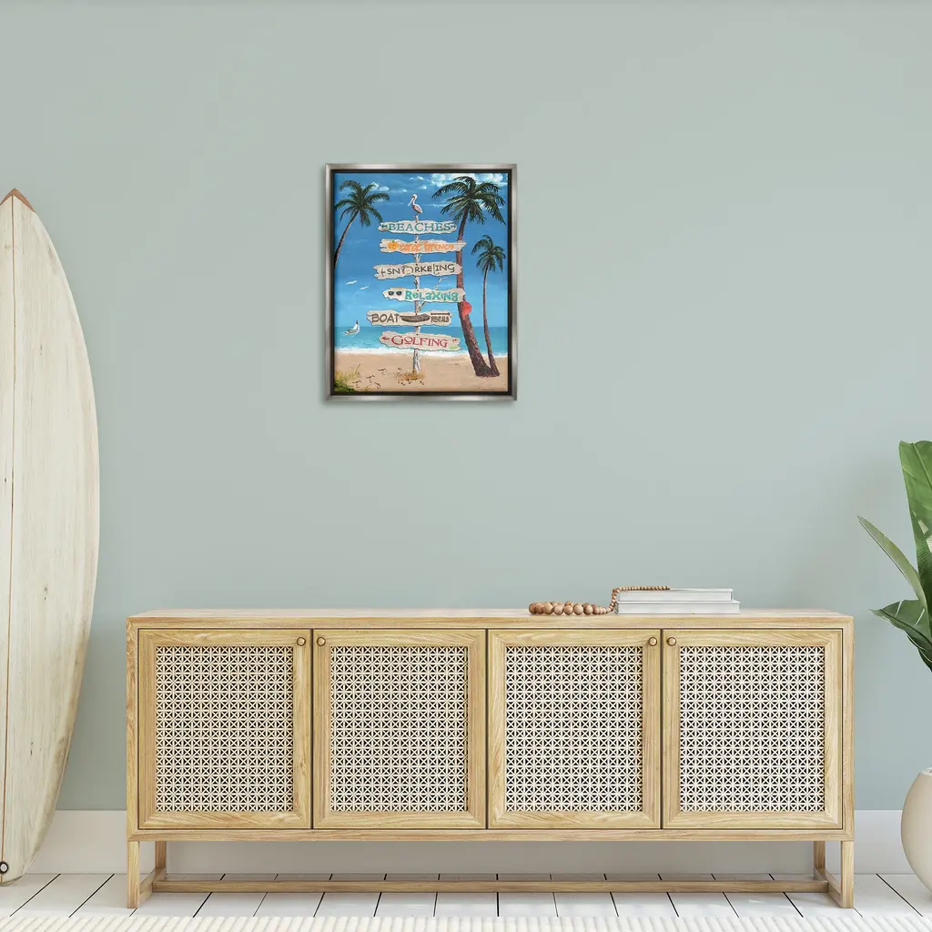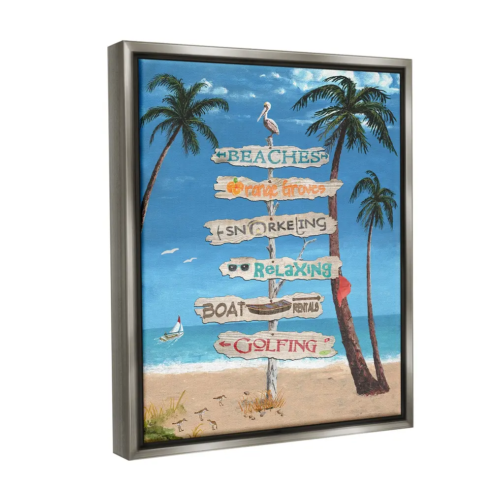 Elevate your home or office to the next level with Stupell Framed Floating Canvas Wall Art. Our premium hand-stretched canvas is mounted securely into a sturdy lightweight frame. The museum-style gap between the wrapped canvas and the box frame gives the illusion of floating artwork. Stupell Wall Art is made in the USA.Features: Dimensions: 17 x 1.7 x 21 Frame, 16 x 1.5 x 20 Canvas ArtFloating Frame Canvas Products are available in sizes 17"x21" and 25"x31". All Floating Frame Canvas Products have a 1.7" Depth.Wall Art is Ready to Hang with Hardware Free Hanging. No Installation required. For Easy Set Up Lean or Layer Artwork on Shelf or Against Wall. Artwork is Permently Fixed into the Frame.Our elevated 1.7" Thick Floating Frame is the perfect complement to our canvas style Wall Art. We use only the highest quality inks in house with industry leading printing solutions. Canvas is hand stretched over a durable wood foundation and then mounted securly into a Modern Box Frame. Made in the USA.Artwork Relates To: Summer, Scenery, Sea, Water, Shoreline, Beach, Coast, Shore, Palm Tree, Sign, Seagull, Sandpiper, BirdDesign by Gail Fraser