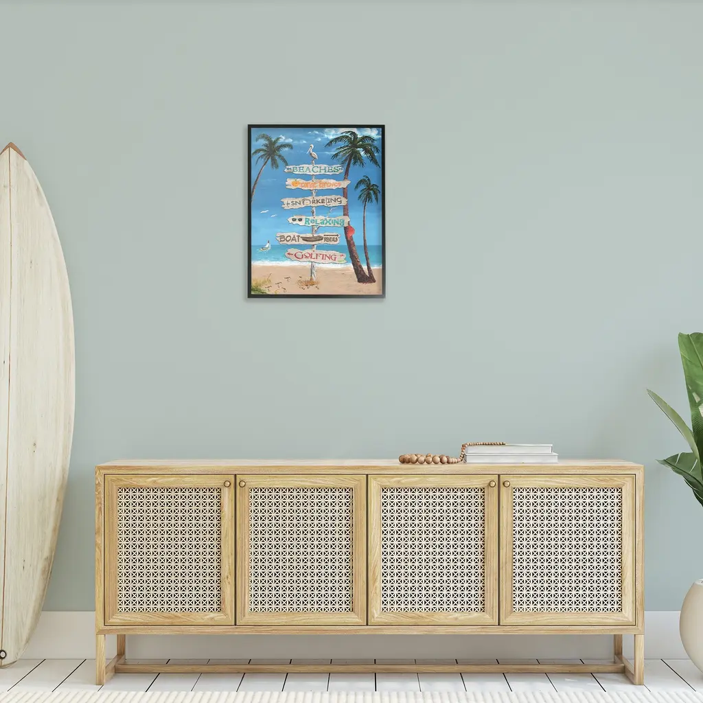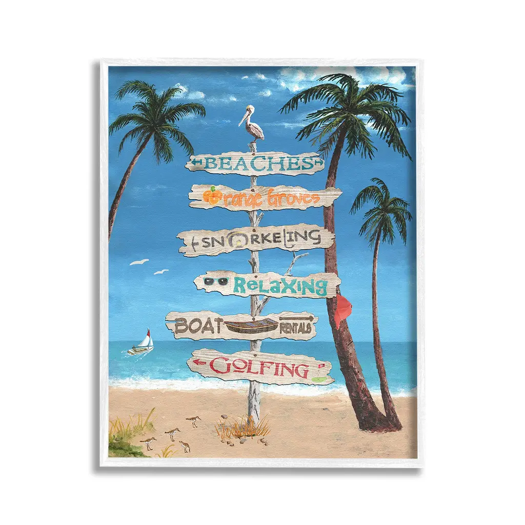 Add dimension to any room with our textured Framed Giclee Artwork. Our framed artwork is securely mounted into a 1.5-inch thick wood grain frame and ready to hang. Frames are available in three alluring styles: black, gray farmhouse and white. In addition, you should check out our oversized options if you want a statement piece. Stupell Wall Art is made in the USA.Features: Dimensions: 11 x 1.5 x 14 FramedFramed Giclee Products are available in the sizes 11"x14", 16"x20" or 24"x30". All Framed Giclee Products have a 1.5" Depth. Wall Art is Ready to Hang with Hardware Free Hanging. No installation required. For Easy Set Up Lean or Layer Artwork on Shelf or Against Wall.Our giclée prints are carefully mounted on a durable MDF backing, and then perfectly finished in a 1.5 inch thick woodgrain frame. Mounted frame colors include black, gray farmhouse and white. Made In USA.Artwork Relates To: Summer, Scenery, Sea, Water, Shoreline, Beach, Coast, Shore, Palm Tree, Sign, Seagull, Sandpiper, BirdDesign by Gail Fraser