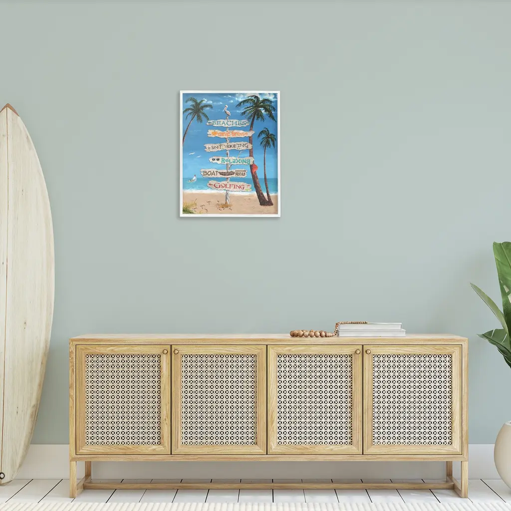 Add dimension to any room with our textured Framed Giclee Artwork. Our framed artwork is securely mounted into a 1.5-inch thick wood grain frame and ready to hang. Frames are available in three alluring styles: black, gray farmhouse and white. In addition, you should check out our oversized options if you want a statement piece. Stupell Wall Art is made in the USA.Features: Dimensions: 11 x 1.5 x 14 FramedFramed Giclee Products are available in the sizes 11"x14", 16"x20" or 24"x30". All Framed Giclee Products have a 1.5" Depth. Wall Art is Ready to Hang with Hardware Free Hanging. No installation required. For Easy Set Up Lean or Layer Artwork on Shelf or Against Wall.Our giclée prints are carefully mounted on a durable MDF backing, and then perfectly finished in a 1.5 inch thick woodgrain frame. Mounted frame colors include black, gray farmhouse and white. Made In USA.Artwork Relates To: Summer, Scenery, Sea, Water, Shoreline, Beach, Coast, Shore, Palm Tree, Sign, Seagull, Sandpiper, BirdDesign by Gail Fraser