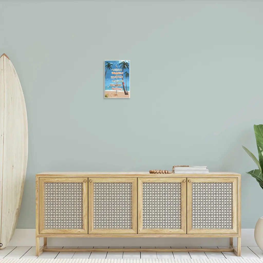 Our wall plaques start as high-quality lithograph prints mounted on durable 0.5-inch thick MDF wood. Each piece is hand finished and comes with a fresh layer of white foil on the sides to give it a crisp, clean look. Plaques arrive ready to hang without installation and come with removable plastic corners to keep them from damage in transit. Stupell Wall Art is made in the USA.Features: Dimensions: 10 x 0.5 x 15 InchesWall Plaque Product Sizes Include 10"x15" and 13"x19". All wall plaque products have a 0.5" Depth. Wall Art is Ready to Hang with Hardware Free Hanging. No installation required. For Easy Set Up Lean or Layer Artwork on Shelf or Against Wall.All of our wall plaques start off as high quality lithograph prints that are then mounted on durable 0.5 inch thick MDF wood. Each piece is hand finished and comes with a fresh layer of foil on the sides to give it a crisp clean look. Made In USA.Artwork Relates To: Summer, Scenery, Sea, Water, Shoreline, Beach, Coast, Shore, Palm Tree, Sign, Seagull, Sandpiper, BirdDesign by Gail Fraser