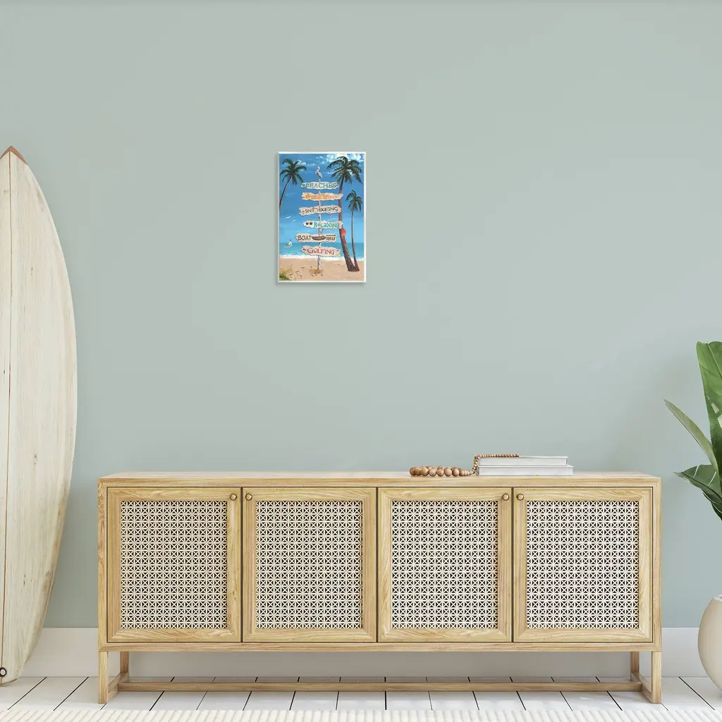Our wall plaques start as high-quality lithograph prints mounted on durable 0.5-inch thick MDF wood. Each piece is hand finished and comes with a fresh layer of white foil on the sides to give it a crisp, clean look. Plaques arrive ready to hang without installation and come with removable plastic corners to keep them from damage in transit. Stupell Wall Art is made in the USA.Features: Dimensions: 10 x 0.5 x 15 InchesWall Plaque Product Sizes Include 10"x15" and 13"x19". All wall plaque products have a 0.5" Depth. Wall Art is Ready to Hang with Hardware Free Hanging. No installation required. For Easy Set Up Lean or Layer Artwork on Shelf or Against Wall.All of our wall plaques start off as high quality lithograph prints that are then mounted on durable 0.5 inch thick MDF wood. Each piece is hand finished and comes with a fresh layer of foil on the sides to give it a crisp clean look. Made In USA.Artwork Relates To: Summer, Scenery, Sea, Water, Shoreline, Beach, Coast, Shore, Palm Tree, Sign, Seagull, Sandpiper, BirdDesign by Gail Fraser