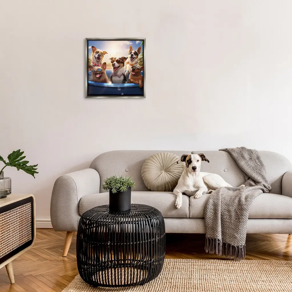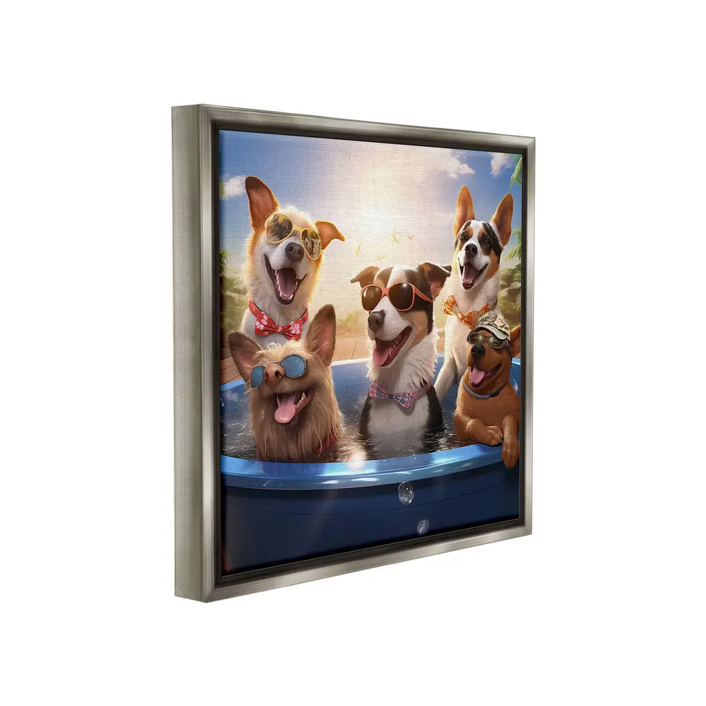 Elevate your home or office to the next level with Stupell Framed Floating Canvas Wall Art. Our premium hand-stretched canvas is mounted securely into a sturdy lightweight frame. The museum-style gap between the wrapped canvas and the box frame gives the illusion of floating artwork. Stupell Wall Art is made in the USA.Features: Dimensions: 18 x 1.7 x 18 Frame, 17 x 1.5 x 17 Canvas ArtFloating Frame Canvas Products are available in sizes 18"x18" and 25"x25". All Floating Frame Canvas Products have a 1.7" Depth.Wall Art is Ready to Hang with Hardware Free Hanging. No Installation required. For Easy Set Up Lean or Layer Artwork on Shelf or Against Wall. Artwork is Permently Fixed into the Frame.Our elevated 1.7" Thick Floating Frame is the perfect complement to our canvas style Wall Art. We use only the highest quality inks in house with industry leading printing solutions. Canvas is hand stretched over a durable wood foundation and then mounted securly into a Modern Box Frame. Made in the USA.Artwork Relates To: Fun, Vacation, Animal, Canine, Dog, Mammal, Pet, Summer, Pool, Sun, Humor, FunnyDesign by Jim Baldwin