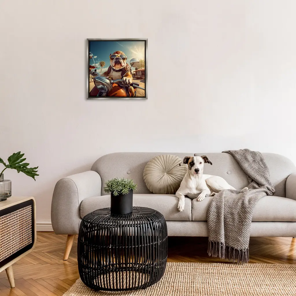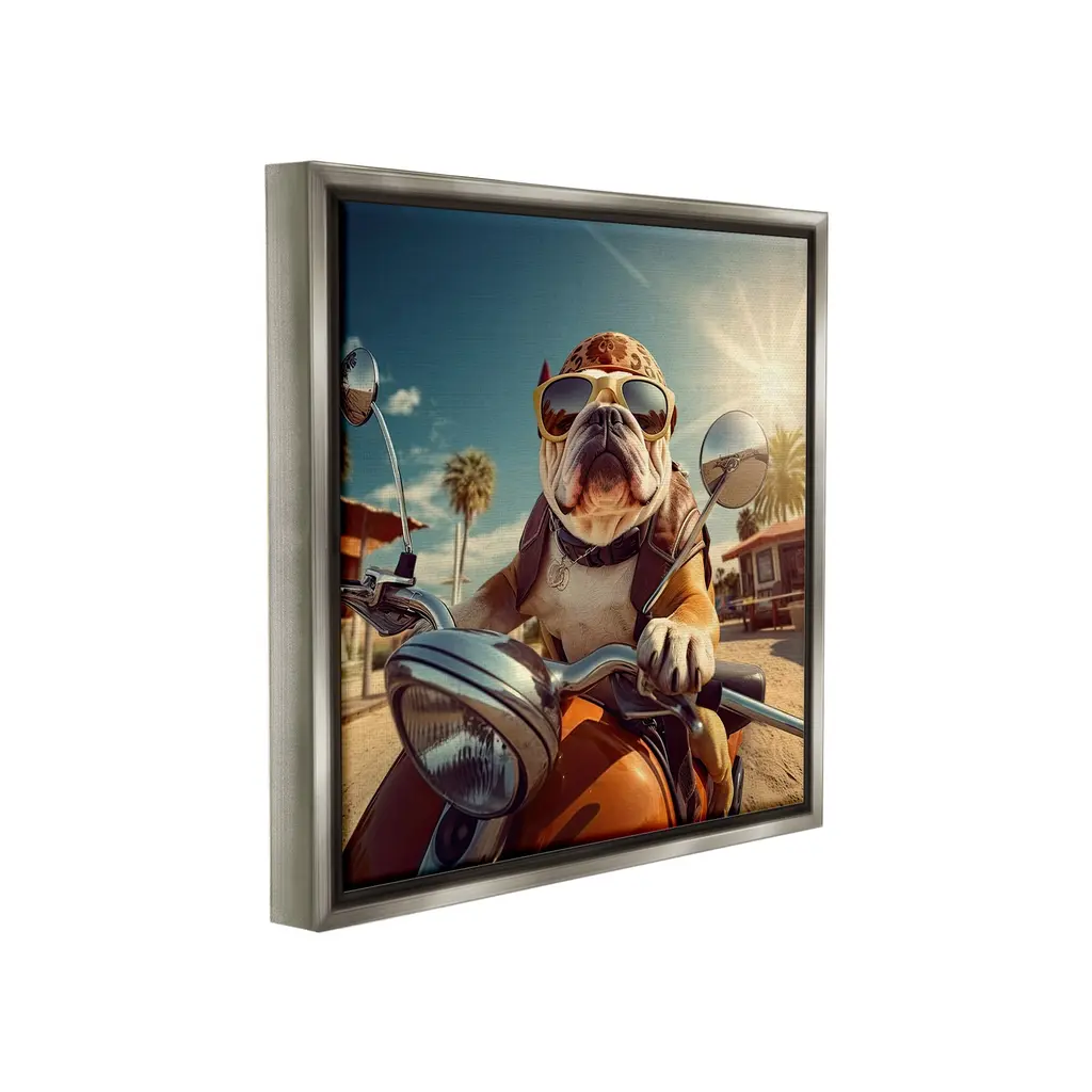 Elevate your home or office to the next level with Stupell Framed Floating Canvas Wall Art. Our premium hand-stretched canvas is mounted securely into a sturdy lightweight frame. The museum-style gap between the wrapped canvas and the box frame gives the illusion of floating artwork. Stupell Wall Art is made in the USA.Features: Dimensions: 18 x 1.7 x 18 Frame, 17 x 1.5 x 17 Canvas ArtFloating Frame Canvas Products are available in sizes 18"x18" and 25"x25". All Floating Frame Canvas Products have a 1.7" Depth.Wall Art is Ready to Hang with Hardware Free Hanging. No Installation required. For Easy Set Up Lean or Layer Artwork on Shelf or Against Wall. Artwork is Permently Fixed into the Frame.Our elevated 1.7" Thick Floating Frame is the perfect complement to our canvas style Wall Art. We use only the highest quality inks in house with industry leading printing solutions. Canvas is hand stretched over a durable wood foundation and then mounted securly into a Modern Box Frame. Made in the USA.Artwork Relates To: Fun, Animal, Canine, Dog, Mammal, Pet, Humor, Funny, Motorcycle, Palm Tree, Tropical, Beach, SummerDesign by Jim Baldwin