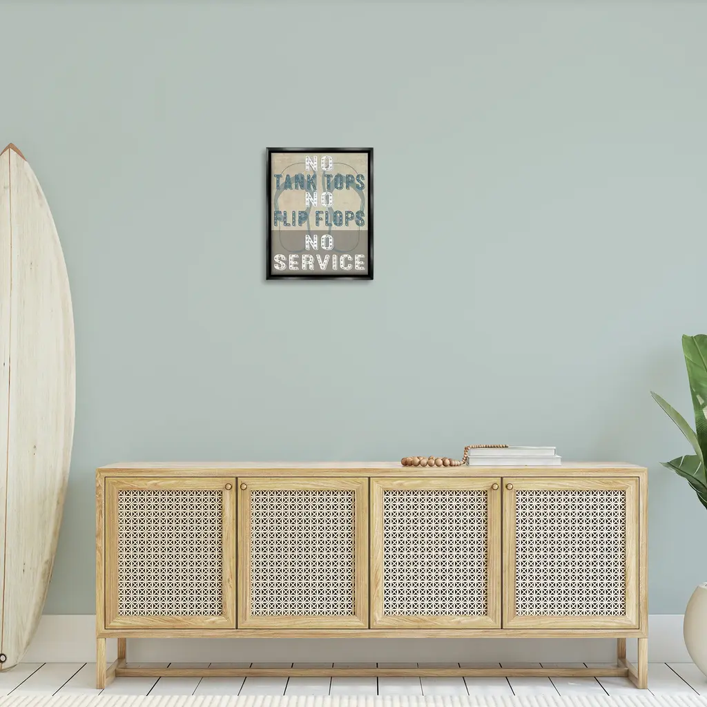 Elevate your home or office to the next level with Stupell Framed Floating Canvas Wall Art. Our premium hand-stretched canvas is mounted securely into a sturdy lightweight frame. The museum-style gap between the wrapped canvas and the box frame gives the illusion of floating artwork. Stupell Wall Art is made in the USA.Features: Dimensions: 17 x 1.7 x 21 Frame, 16 x 1.5 x 20 Canvas ArtFloating Frame Canvas Products are available in sizes 17"x21" and 25"x31". All Floating Frame Canvas Products have a 1.7" Depth.Wall Art is Ready to Hang with Hardware Free Hanging. No Installation required. For Easy Set Up Lean or Layer Artwork on Shelf or Against Wall. Artwork is Permently Fixed into the Frame.Our elevated 1.7" Thick Floating Frame is the perfect complement to our canvas style Wall Art. We use only the highest quality inks in house with industry leading printing solutions. Canvas is hand stretched over a durable wood foundation and then mounted securly into a Modern Box Frame. Made in the USA.Artwork Relates To: Phrase, Humor, Nautical, Beach, Rustic, Vintage, Lake, No Tank Tops No Flip Flops No ServiceDesign by GraffiTee Studios