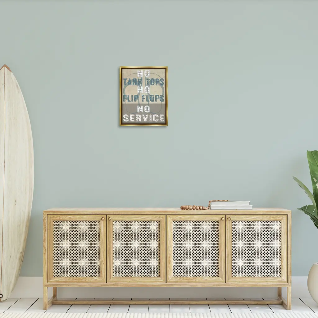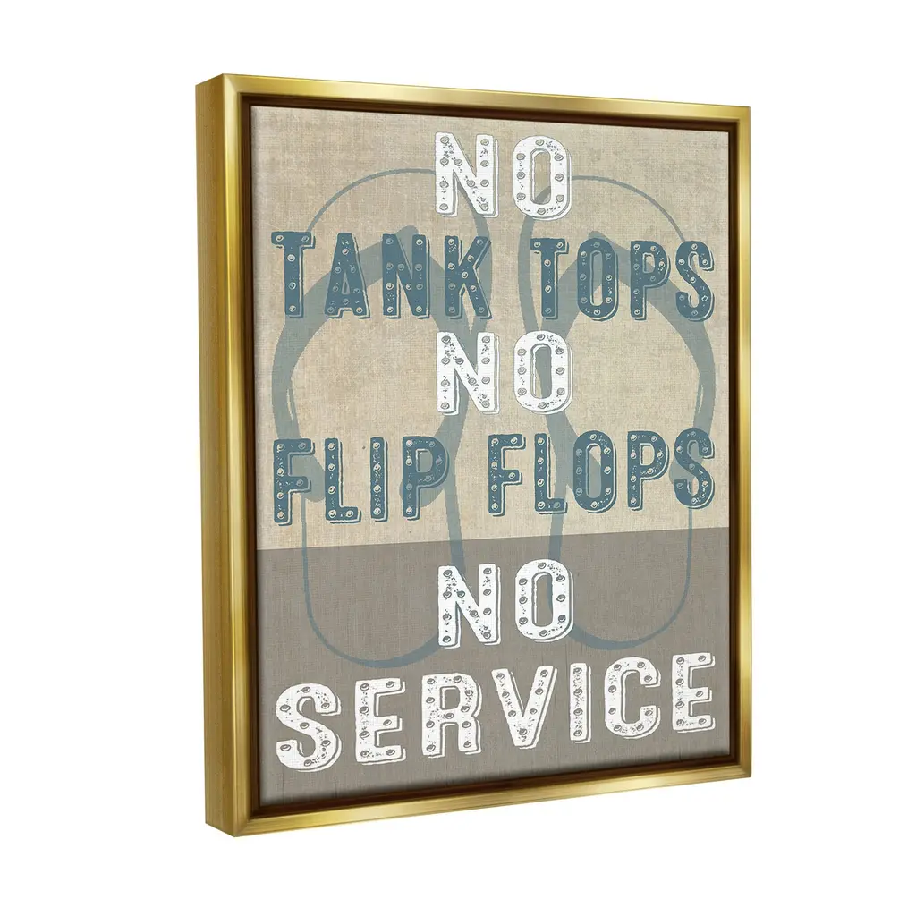 Elevate your home or office to the next level with Stupell Framed Floating Canvas Wall Art. Our premium hand-stretched canvas is mounted securely into a sturdy lightweight frame. The museum-style gap between the wrapped canvas and the box frame gives the illusion of floating artwork. Stupell Wall Art is made in the USA.Features: Dimensions: 17 x 1.7 x 21 Frame, 16 x 1.5 x 20 Canvas ArtFloating Frame Canvas Products are available in sizes 17"x21" and 25"x31". All Floating Frame Canvas Products have a 1.7" Depth.Wall Art is Ready to Hang with Hardware Free Hanging. No Installation required. For Easy Set Up Lean or Layer Artwork on Shelf or Against Wall. Artwork is Permently Fixed into the Frame.Our elevated 1.7" Thick Floating Frame is the perfect complement to our canvas style Wall Art. We use only the highest quality inks in house with industry leading printing solutions. Canvas is hand stretched over a durable wood foundation and then mounted securly into a Modern Box Frame. Made in the USA.Artwork Relates To: Phrase, Humor, Nautical, Beach, Rustic, Vintage, Lake, No Tank Tops No Flip Flops No ServiceDesign by GraffiTee Studios