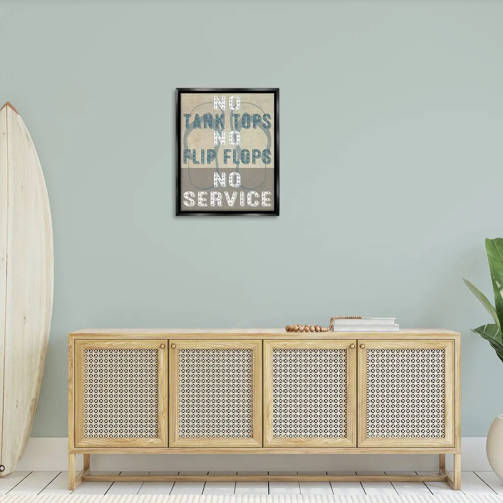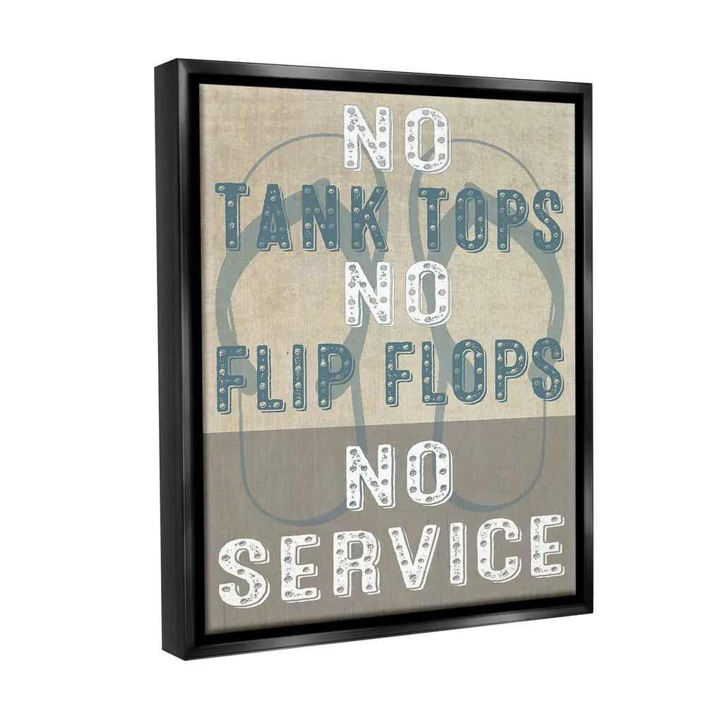 Elevate your home or office to the next level with Stupell Framed Floating Canvas Wall Art. Our premium hand-stretched canvas is mounted securely into a sturdy lightweight frame. The museum-style gap between the wrapped canvas and the box frame gives the illusion of floating artwork. Stupell Wall Art is made in the USA.Features: Dimensions: 17 x 1.7 x 21 Frame, 16 x 1.5 x 20 Canvas ArtFloating Frame Canvas Products are available in sizes 17"x21" and 25"x31". All Floating Frame Canvas Products have a 1.7" Depth.Wall Art is Ready to Hang with Hardware Free Hanging. No Installation required. For Easy Set Up Lean or Layer Artwork on Shelf or Against Wall. Artwork is Permently Fixed into the Frame.Our elevated 1.7" Thick Floating Frame is the perfect complement to our canvas style Wall Art. We use only the highest quality inks in house with industry leading printing solutions. Canvas is hand stretched over a durable wood foundation and then mounted securly into a Modern Box Frame. Made in the USA.Artwork Relates To: Phrase, Humor, Nautical, Beach, Rustic, Vintage, Lake, No Tank Tops No Flip Flops No ServiceDesign by GraffiTee Studios