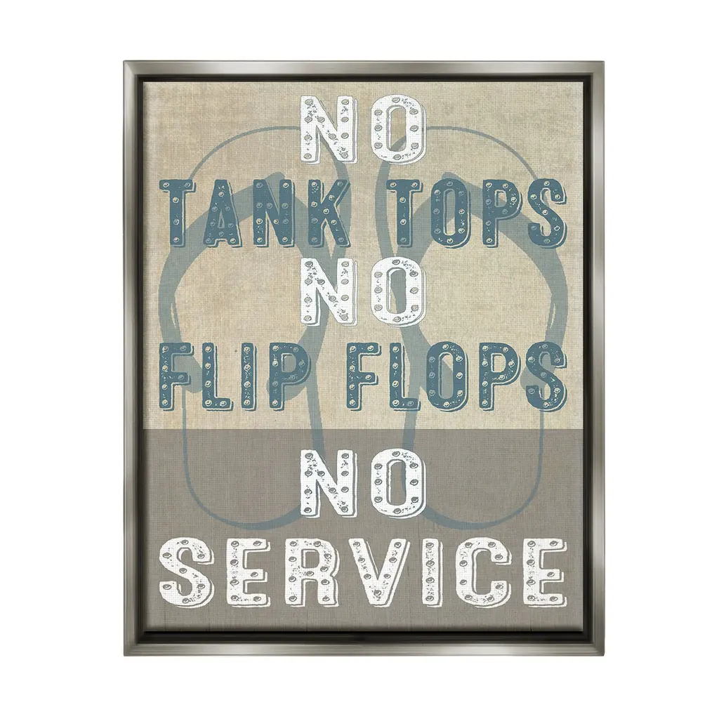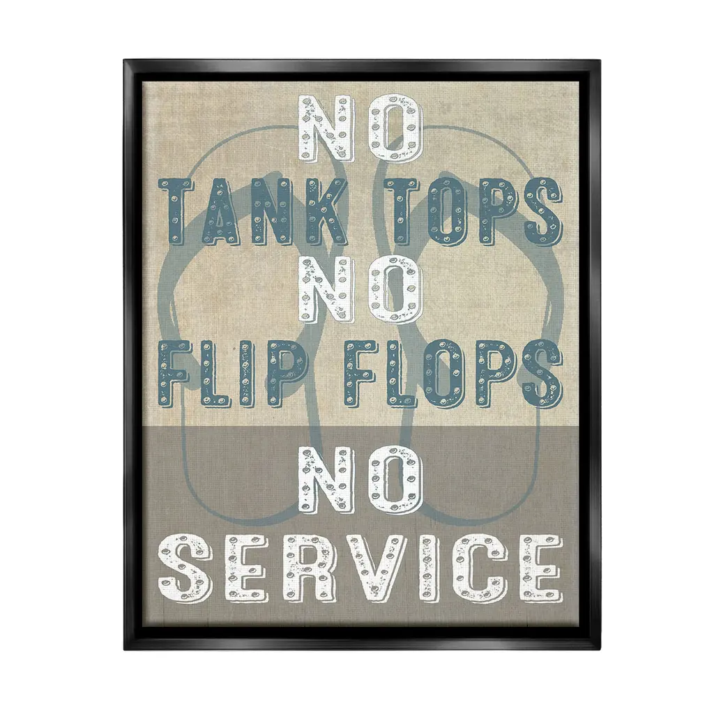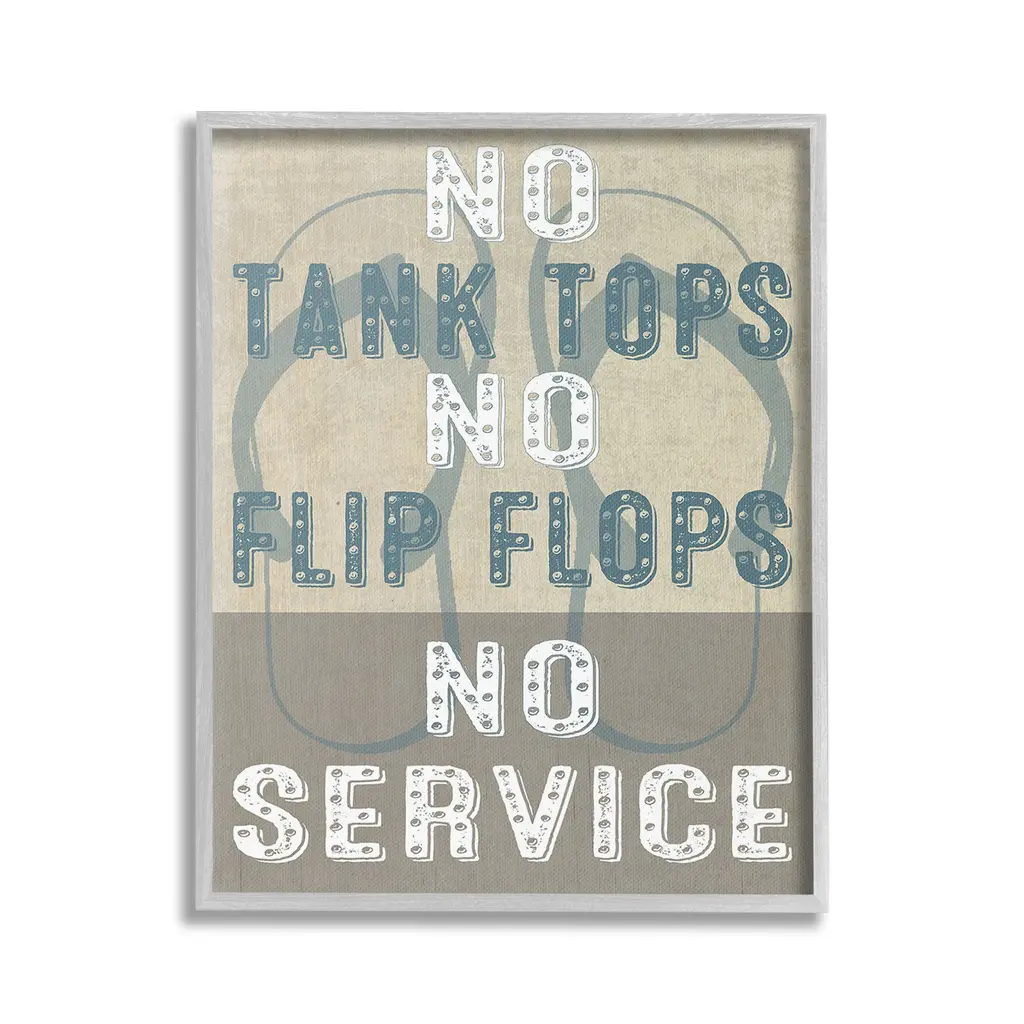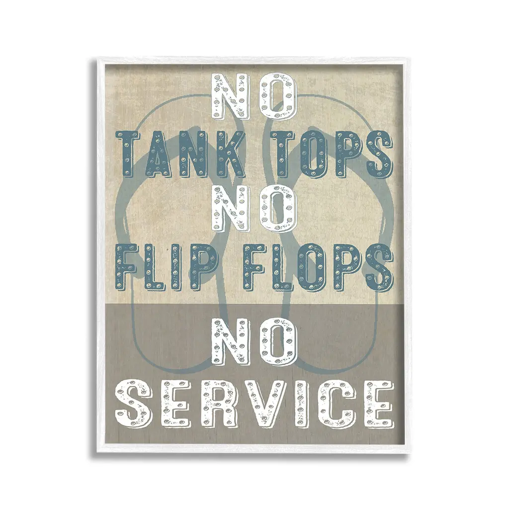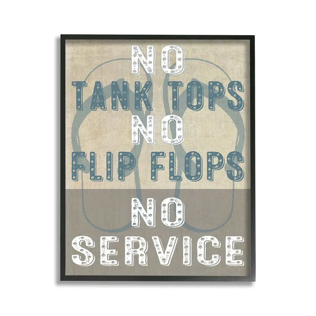 Add dimension to any room with our textured Framed Giclee Artwork. Our framed artwork is securely mounted into a 1.5-inch thick wood grain frame and ready to hang. Frames are available in three alluring styles: black, gray farmhouse and white. In addition, you should check out our oversized options if you want a statement piece. Stupell Wall Art is made in the USA.Features: Dimensions: 11 x 1.5 x 14 FramedFramed Giclee Products are available in the sizes 11"x14", 16"x20" or 24"x30". All Framed Giclee Products have a 1.5" Depth. Wall Art is Ready to Hang with Hardware Free Hanging. No installation required. For Easy Set Up Lean or Layer Artwork on Shelf or Against Wall.Our giclée prints are carefully mounted on a durable MDF backing, and then perfectly finished in a 1.5 inch thick woodgrain frame. Mounted frame colors include black, gray farmhouse and white. Made In USA.Artwork Relates To: Phrase, Humor, Nautical, Beach, Rustic, Vintage, Lake, No Tank Tops No Flip Flops No ServiceDesign by GraffiTee Studios