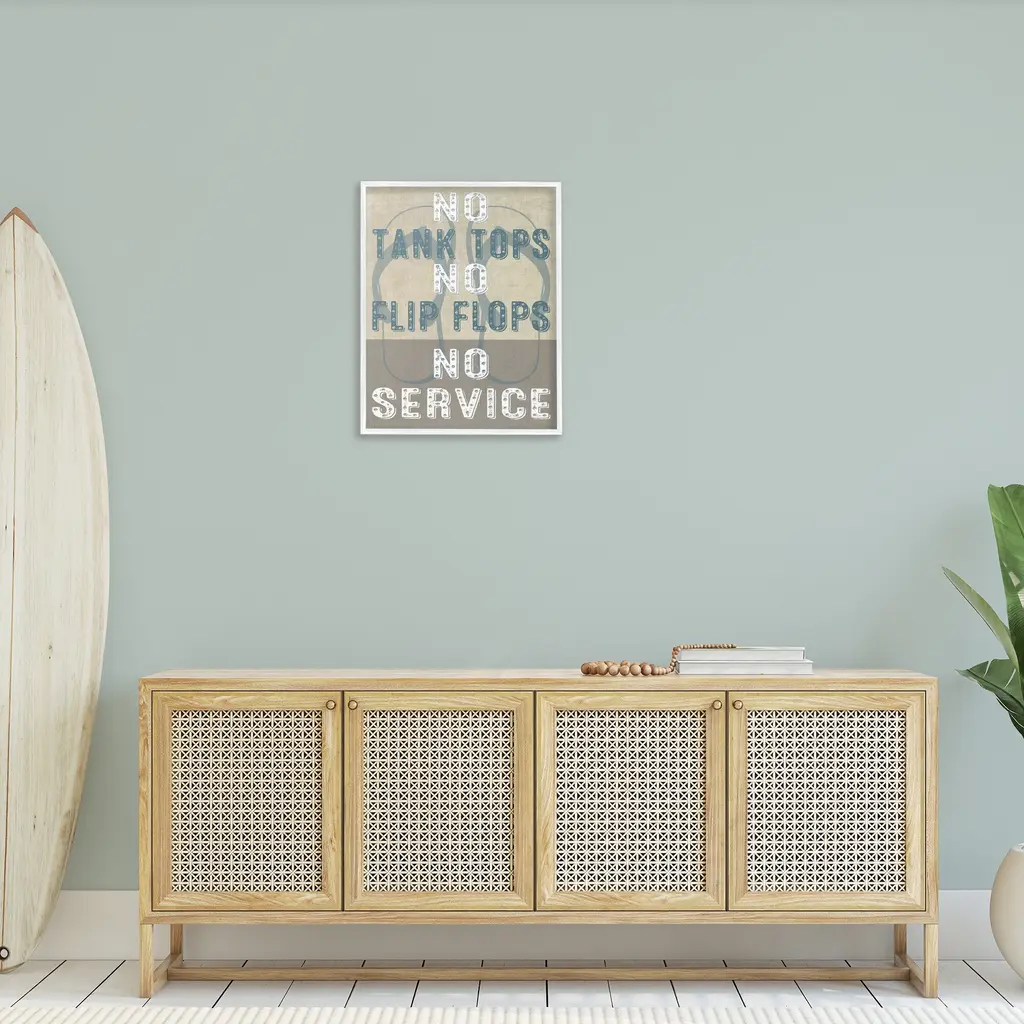Add dimension to any room with our textured Framed Giclee Artwork. Our framed artwork is securely mounted into a 1.5-inch thick wood grain frame and ready to hang. Frames are available in three alluring styles: black, gray farmhouse and white. In addition, you should check out our oversized options if you want a statement piece. Stupell Wall Art is made in the USA.Features: Dimensions: 11 x 1.5 x 14 FramedFramed Giclee Products are available in the sizes 11"x14", 16"x20" or 24"x30". All Framed Giclee Products have a 1.5" Depth. Wall Art is Ready to Hang with Hardware Free Hanging. No installation required. For Easy Set Up Lean or Layer Artwork on Shelf or Against Wall.Our giclée prints are carefully mounted on a durable MDF backing, and then perfectly finished in a 1.5 inch thick woodgrain frame. Mounted frame colors include black, gray farmhouse and white. Made In USA.Artwork Relates To: Phrase, Humor, Nautical, Beach, Rustic, Vintage, Lake, No Tank Tops No Flip Flops No ServiceDesign by GraffiTee Studios