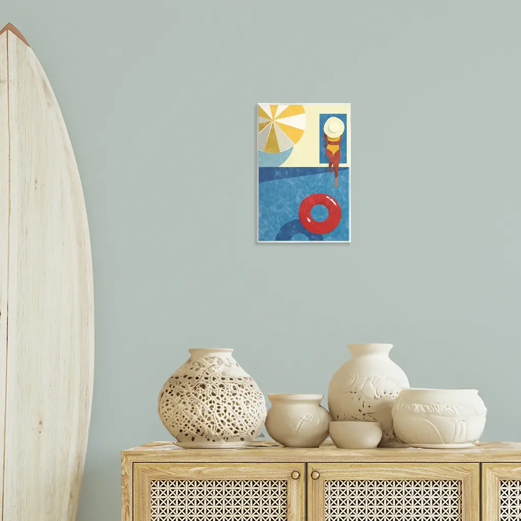 Our wall plaques start as high-quality lithograph prints mounted on durable 0.5-inch thick MDF wood. Each piece is hand finished and comes with a fresh layer of white foil on the sides to give it a crisp, clean look. Plaques arrive ready to hang without installation and come with removable plastic corners to keep them from damage in transit. Stupell Wall Art is made in the USA.Features: Dimensions: 10 x 0.5 x 15 InchesWall Plaque Product Sizes Include 10"x15" and 13"x19". All wall plaque products have a 0.5" Depth. Wall Art is Ready to Hang with Hardware Free Hanging. No installation required. For Easy Set Up Lean or Layer Artwork on Shelf or Against Wall.All of our wall plaques start off as high quality lithograph prints that are then mounted on durable 0.5 inch thick MDF wood. Each piece is hand finished and comes with a fresh layer of foil on the sides to give it a crisp clean look. Made In USA.Artwork Relates To: Person, Pool, Water, Summer, Umbrella, Pool Float, WomanDesign by Victoria Barnes