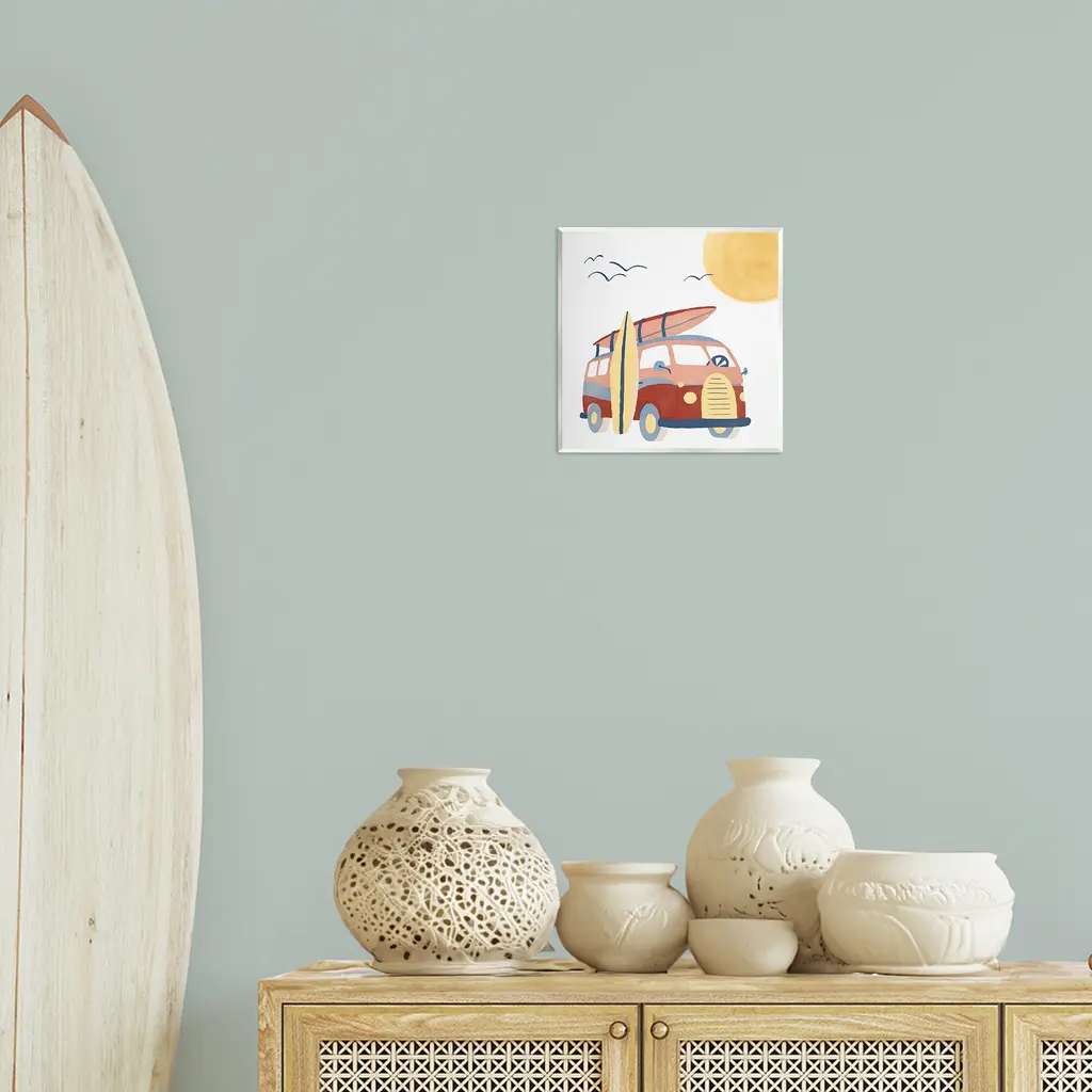 Our wall plaques start as high-quality lithograph prints mounted on durable 0.5-inch thick MDF wood. Each piece is hand finished and comes with a fresh layer of white foil on the sides to give it a crisp, clean look. Plaques arrive ready to hang without installation and come with removable plastic corners to keep them from damage in transit. Stupell Wall Art is made in the USA.Features: Dimensions: 12 x 0.5 x 12 InchesWall Art is Ready to Hang with Hardware Free Hanging. No installation required. For Easy Set Up Lean or Layer Artwork on Shelf or Against Wall.All of our wall plaques start off as high quality lithograph prints that are then mounted on durable 0.5 inch thick MDF wood. Each piece is hand finished and comes with a fresh layer of foil on the sides to give it a crisp clean look. Made In USA.Artwork Relates To: Nature, Sport, Surfing, Transportation, Van, Vehicle, Car, Summer, Beach, Travel, Vacation, Surfboard, BirdDesign by Carrie Cantwell