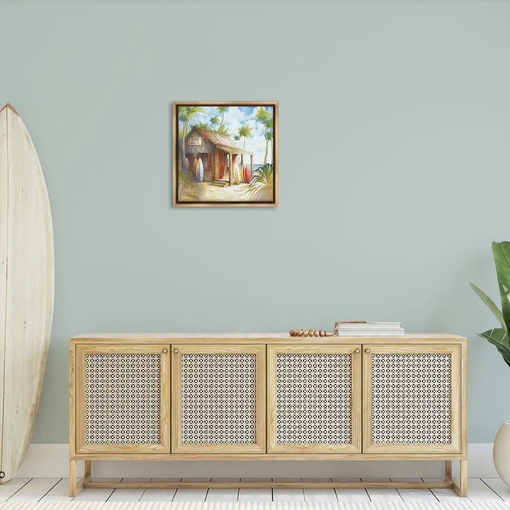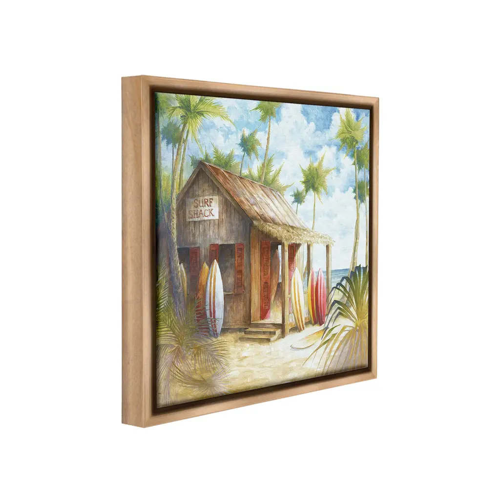 Elevate your home or office to the next level with Stupell Framed Floating Canvas Wall Art. Our premium hand-stretched canvas is mounted securely into a sturdy lightweight frame. The museum-style gap between the wrapped canvas and the box frame gives the illusion of floating artwork. Stupell Wall Art is made in the USA.Features: Dimensions: 18 x 1.7 x 18 Frame, 17 x 1.5 x 17 Canvas ArtFloating Frame Canvas Products are available in sizes 18"x18" and 25"x25". All Floating Frame Canvas Products have a 1.7" Depth.Wall Art is Ready to Hang with Hardware Free Hanging. No Installation required. For Easy Set Up Lean or Layer Artwork on Shelf or Against Wall. Artwork is Permently Fixed into the Frame.Our elevated 1.7" Thick Floating Frame is the perfect complement to our canvas style Wall Art. We use only the highest quality inks in house with industry leading printing solutions. Canvas is hand stretched over a durable wood foundation and then mounted securly into a Modern Box Frame. Made in the USA.Artwork Relates To: Beach, Summer, Shore, Ocean, Sea, Tropical, Palm Tree, Surfboard, ShackDesign by Cloverfield & Co.