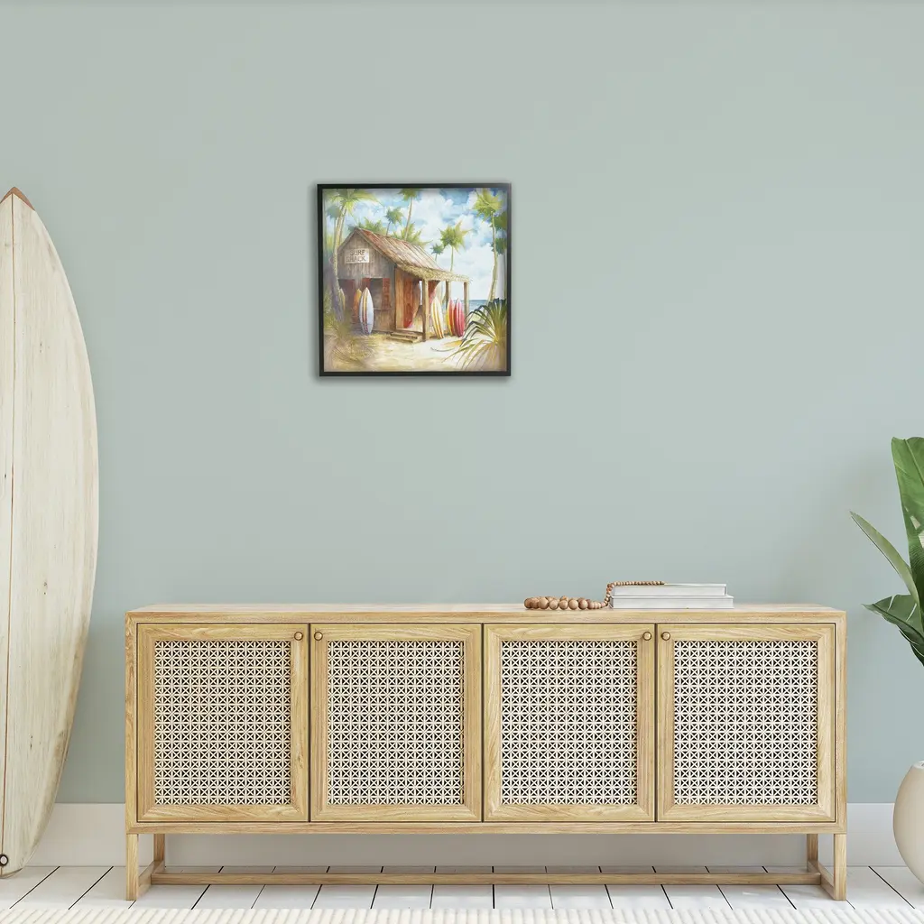 Add dimension to any room with our textured Framed Giclee Artwork. Our framed artwork is securely mounted into a 1.5-inch thick wood grain frame and ready to hang. Frames are available in three alluring styles: black, gray farmhouse and white. In addition, you should check out our oversized options if you want a statement piece. Stupell Wall Art is made in the USA.Features: Dimensions: 12 x 1.5 x 12 FramedFramed Giclee Product Sizes Include 12"x12", 17"x17", and 24"x24". Framed Giclee Products have a 1.5" Depth. Wall Art is Ready to Hang with Hardware Free Hanging. No installation required. For Easy Set Up Lean or Layer Artwork on Shelf or Against Wall.Our giclée prints are carefully mounted on a durable MDF backing, and then perfectly finished in a 1.5 inch thick woodgrain frame. Mounted frame colors include black, gray farmhouse and white. Made In USA.Artwork Relates To: Beach, Summer, Shore, Ocean, Sea, Tropical, Palm Tree, Surfboard, ShackDesign by Cloverfield & Co.