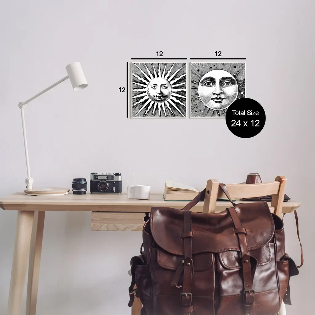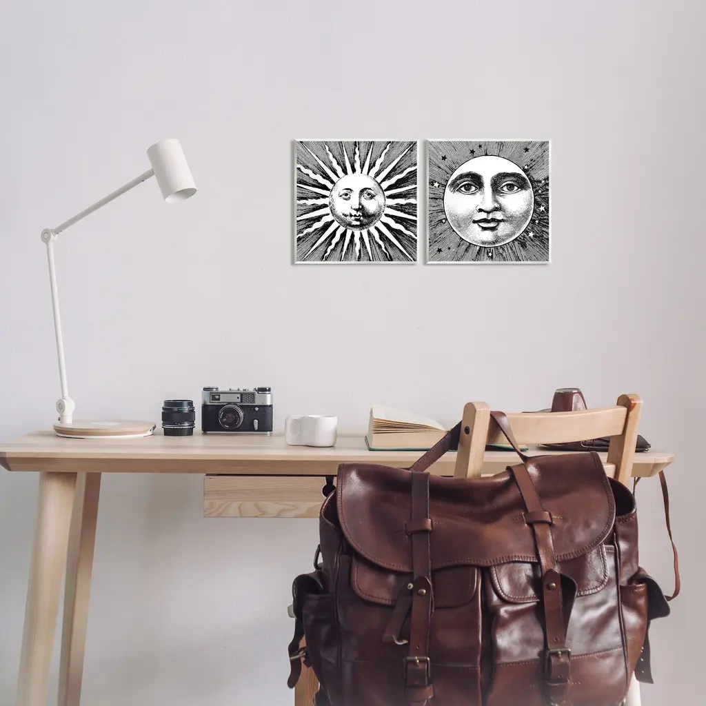 Fill any space with Stupell Wall Art Sets. Our wall plaques start as high-quality lithograph prints mounted on durable 0.5-inch thick MDF wood. Each piece is hand finished and comes with a fresh layer of white foil on the sides to give it a crisp, clean look. Plaques arrive ready to hang without installation and come with removable plastic corners to keep them from damage in transit. Stupell Industries Wall Art is made in the USA.Features: Dimensions: 2 Piece Set, Each Panel is 12 x 0.5 x 12 InchesWall Art is Ready to Hang with Hardware Free Hanging. No installation required. For Easy Set Up Lean or Layer Artwork on Shelf or Against Wall.All of our wall plaques start off as high quality lithograph prints that are then mounted on durable 0.5 inch thick MDF wood. Each piece is hand finished and comes with a fresh layer of foil on the sides to give it a crisp clean look. Made In USA.Artwork Relates To: Face, Sun, Moon, Astrology, BohoDesign by Lil' Rue
