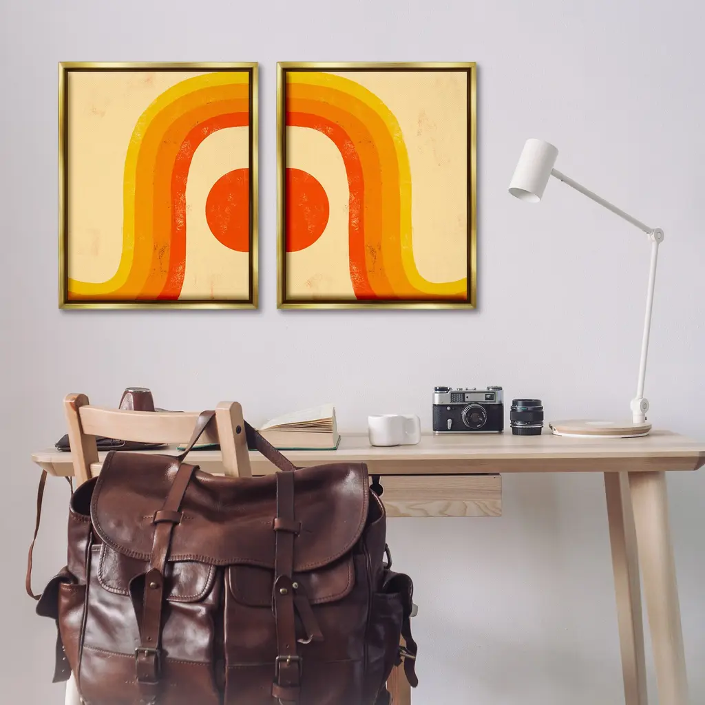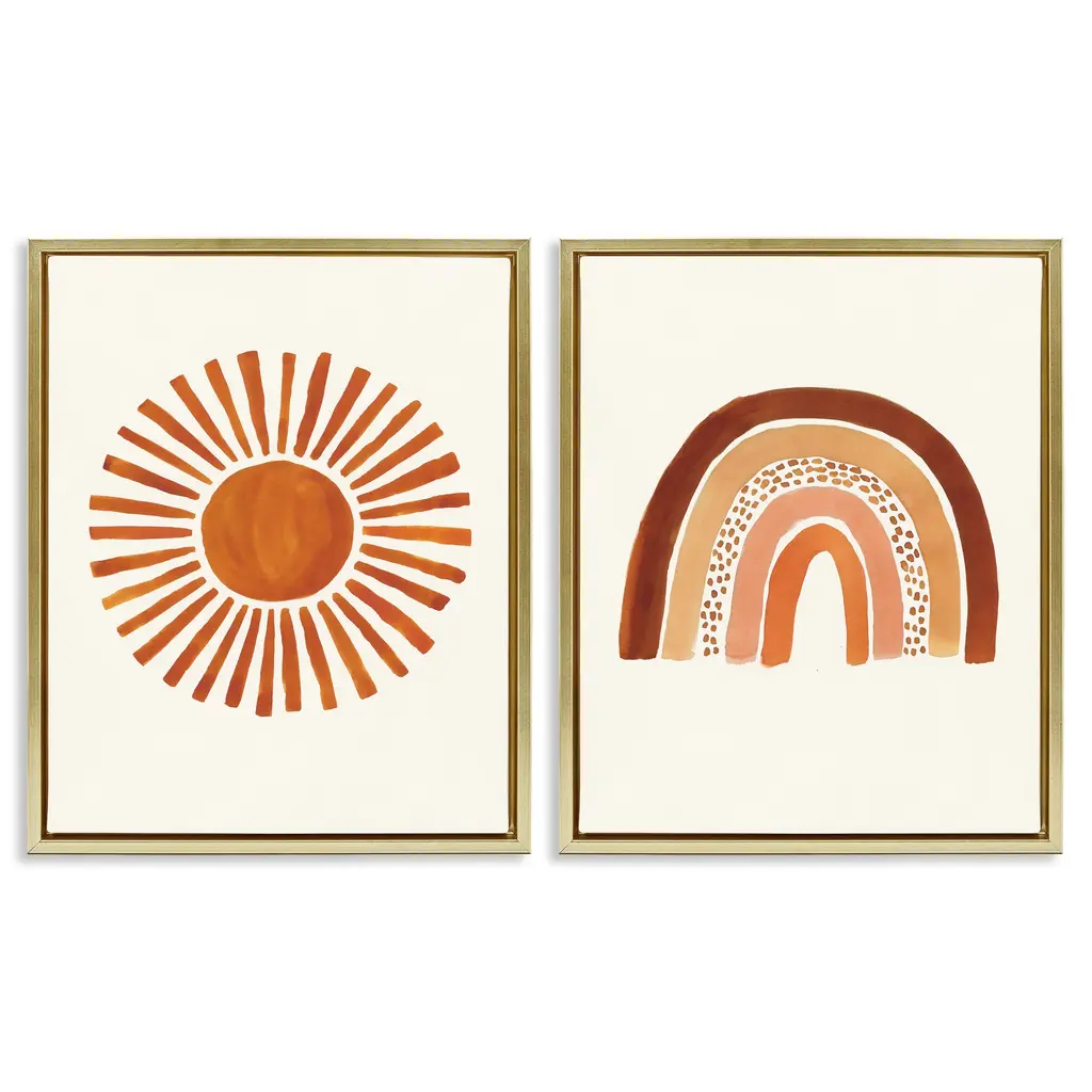 Elevate your home or office to the next level with Stupell Framed Floating Canvas Wall Art. Our premium hand-stretched canvas is mounted securely into a sturdy lightweight frame. The museum-style gap between the wrapped canvas and the box frame gives the illusion of floating artwork. Stupell Wall Art is made in the USA.Features: Dimensions: 2 Piece Set, Each Frame is 17 x 1.7 x 21Two Piece Floater Framed Canvas are available as 17x21 or 25x31 Panels. All Floater Frame Products have a 1.7" Depth.Wall Art is Ready to Hang with Hardware Free Hanging. No Installation required. For Easy Set Up Lean or Layer Artwork on Shelf or Against Wall. Artwork is Permently Fixed into the Frame.Our elevated 1.7" Thick Floating Frame is the perfect complement to our canvas style Wall Art. We use only the highest quality inks in house with industry leading printing solutions. Canvas is hand stretched over a durable wood foundation and then mounted securly into a Modern Box Frame. Made in the USA.Artwork Relates To: Groovy, Vintage, Nature, Geometric, Abstract, Sun, Rainbow, Arch, PatternDesign by Daphne Polselli
