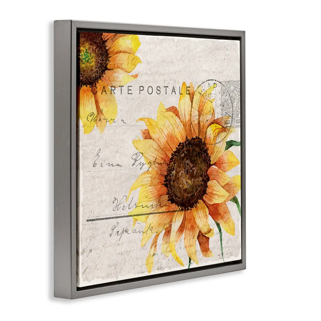 Elevate your home or office to the next level with Stupell Framed Floating Canvas Wall Art. Our premium hand-stretched canvas is mounted securely into a sturdy lightweight frame. The museum-style gap between the wrapped canvas and the box frame gives the illusion of floating artwork. Stupell Wall Art is made in the USA.Features: Dimensions: 18 x 1.7 x 18 Frame, 17 x 1.5 x 17 Canvas ArtFloating Frame Canvas Products are available in sizes 18"x18" and 25"x25". All Floating Frame Canvas Products have a 1.7" Depth.Wall Art is Ready to Hang with Hardware Free Hanging. No Installation required. For Easy Set Up Lean or Layer Artwork on Shelf or Against Wall. Artwork is Permently Fixed into the Frame.Our elevated 1.7" Thick Floating Frame is the perfect complement to our canvas style Wall Art. We use only the highest quality inks in house with industry leading printing solutions. Canvas is hand stretched over a durable wood foundation and then mounted securly into a Modern Box Frame. Made in the USA.Artwork Relates To: Vintage, Floral, Flower, Sunflower, Phrase, Rustic, Mail, LetterDesign by Kim Allen
