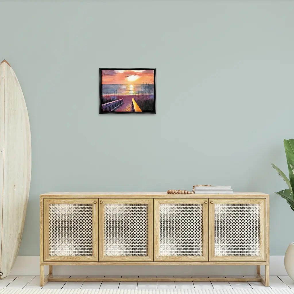 Elevate your home or office to the next level with Stupell Framed Floating Canvas Wall Art. Our premium hand-stretched canvas is mounted securely into a sturdy lightweight frame. The museum-style gap between the wrapped canvas and the box frame gives the illusion of floating artwork. Stupell Wall Art is made in the USA.Features: Dimensions: 21 x 1.7 x 17 Frame, 20 x 1.5 x 16 Canvas ArtFloating Frame Canvas Products are available in sizes 21"x17" and 31"x25". All Floating Frame Canvas Products have a 1.7" Depth.Wall Art is Ready to Hang with Hardware Free Hanging. No Installation required. For Easy Set Up Lean or Layer Artwork on Shelf or Against Wall. Artwork is Permently Fixed into the Frame.Our elevated 1.7" Thick Floating Frame is the perfect complement to our canvas style Wall Art. We use only the highest quality inks in house with industry leading printing solutions. Canvas is hand stretched over a durable wood foundation and then mounted securly into a Modern Box Frame. Made in the USA.Artwork Relates To: Summer, Scenery, Sea, Water, Shoreline, Beach, Coast, Shore, Sunset, SunriseDesign by Christine Reichow