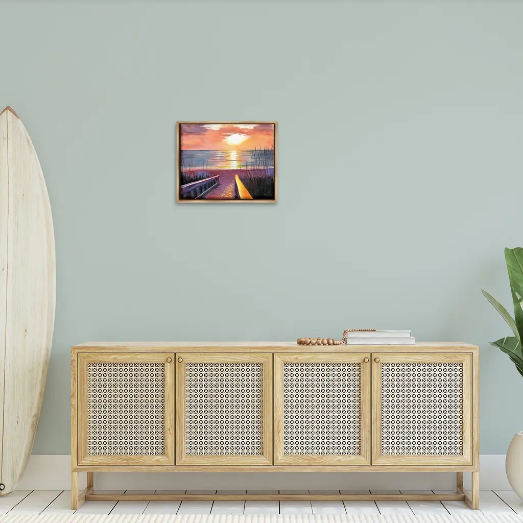 Elevate your home or office to the next level with Stupell Framed Floating Canvas Wall Art. Our premium hand-stretched canvas is mounted securely into a sturdy lightweight frame. The museum-style gap between the wrapped canvas and the box frame gives the illusion of floating artwork. Stupell Wall Art is made in the USA.Features: Dimensions: 21 x 1.7 x 17 Frame, 20 x 1.5 x 16 Canvas ArtFloating Frame Canvas Products are available in sizes 21"x17" and 31"x25". All Floating Frame Canvas Products have a 1.7" Depth.Wall Art is Ready to Hang with Hardware Free Hanging. No Installation required. For Easy Set Up Lean or Layer Artwork on Shelf or Against Wall. Artwork is Permently Fixed into the Frame.Our elevated 1.7" Thick Floating Frame is the perfect complement to our canvas style Wall Art. We use only the highest quality inks in house with industry leading printing solutions. Canvas is hand stretched over a durable wood foundation and then mounted securly into a Modern Box Frame. Made in the USA.Artwork Relates To: Summer, Scenery, Sea, Water, Shoreline, Beach, Coast, Shore, Sunset, SunriseDesign by Christine Reichow