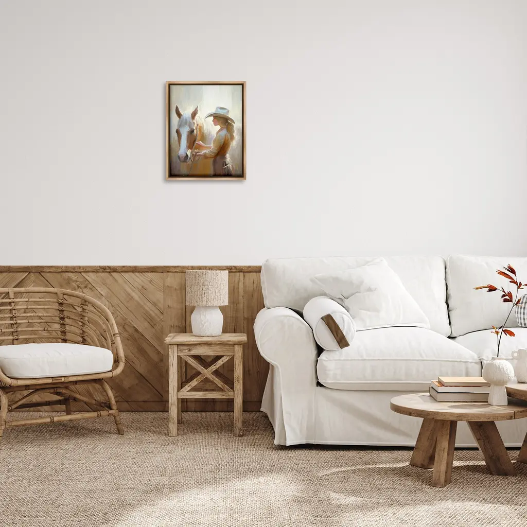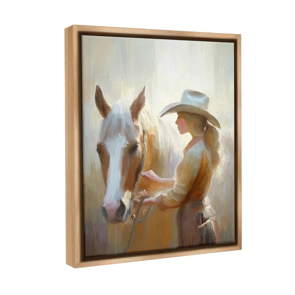 Elevate your home or office to the next level with Stupell Framed Floating Canvas Wall Art. Our premium hand-stretched canvas is mounted securely into a sturdy lightweight frame. The museum-style gap between the wrapped canvas and the box frame gives the illusion of floating artwork. Stupell Wall Art is made in the USA.Features: Dimensions: 17 x 1.7 x 21 Frame, 16 x 1.5 x 20 Canvas ArtFloating Frame Canvas Products are available in sizes 17"x21" and 25"x31". All Floating Frame Canvas Products have a 1.7" Depth.Wall Art is Ready to Hang with Hardware Free Hanging. No Installation required. For Easy Set Up Lean or Layer Artwork on Shelf or Against Wall. Artwork is Permently Fixed into the Frame.Our elevated 1.7" Thick Floating Frame is the perfect complement to our canvas style Wall Art. We use only the highest quality inks in house with industry leading printing solutions. Canvas is hand stretched over a durable wood foundation and then mounted securly into a Modern Box Frame. Made in the USA.Artwork Relates To: Equestrian, Rodeo, Country, Southwestern, Cowgirl, Animal, HorseDesign by Ramona Murdock