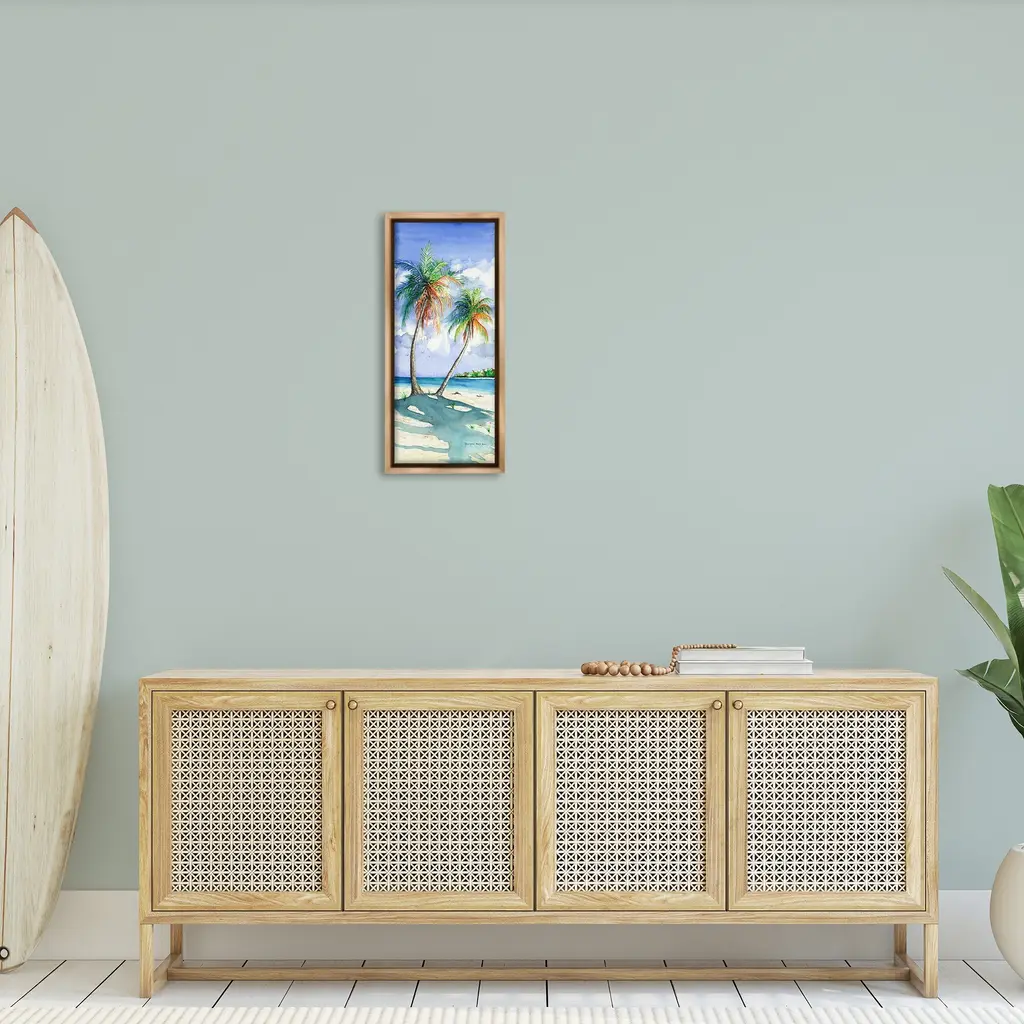 Elevate your home or office to the next level with Stupell Framed Floating Canvas Wall Art. Our premium hand-stretched canvas is mounted securely into a sturdy lightweight frame. The museum-style gap between the wrapped canvas and the box frame gives the illusion of floating artwork. Stupell Wall Art is made in the USA.Features: Dimensions: 11 x 1.7 x 25 Frame, 10 x 1.5 x 24 Canvas ArtFloating Frame Canvas Products are available in sizes 11"x25" and 14"x31". All Floating Frame Canvas Products have a 1.7" Depth.Wall Art is Ready to Hang with Hardware Free Hanging. No Installation required. For Easy Set Up Lean or Layer Artwork on Shelf or Against Wall. Artwork is Permently Fixed into the Frame.Our elevated 1.7" Thick Floating Frame is the perfect complement to our canvas style Wall Art. We use only the highest quality inks in house with industry leading printing solutions. Canvas is hand stretched over a durable wood foundation and then mounted securly into a Modern Box Frame. Made in the USA.Artwork Relates To: Sky, Horizon, Sea, Water, Beach, Coast, Shoreline, Scenery, Sea Waves, Summer, Tropical, Palm TreeDesign by Christine Reichow