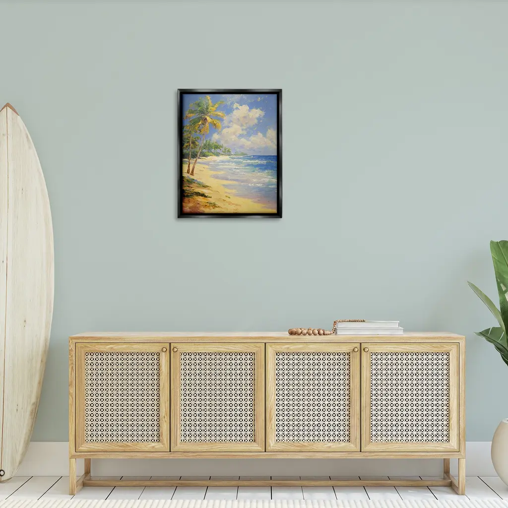 Elevate your home or office to the next level with Stupell Framed Floating Canvas Wall Art. Our premium hand-stretched canvas is mounted securely into a sturdy lightweight frame. The museum-style gap between the wrapped canvas and the box frame gives the illusion of floating artwork. Stupell Wall Art is made in the USA.Features: Dimensions: 17 x 1.7 x 21 Frame, 16 x 1.5 x 20 Canvas ArtFloating Frame Canvas Products are available in sizes 17"x21" and 25"x31". All Floating Frame Canvas Products have a 1.7" Depth.Wall Art is Ready to Hang with Hardware Free Hanging. No Installation required. For Easy Set Up Lean or Layer Artwork on Shelf or Against Wall. Artwork is Permently Fixed into the Frame.Our elevated 1.7" Thick Floating Frame is the perfect complement to our canvas style Wall Art. We use only the highest quality inks in house with industry leading printing solutions. Canvas is hand stretched over a durable wood foundation and then mounted securly into a Modern Box Frame. Made in the USA.Artwork Relates To: Summer, Scenery, Sea, Water, Shoreline, Beach, Coast, Shore, Palm TreeDesign by Gina Kelly