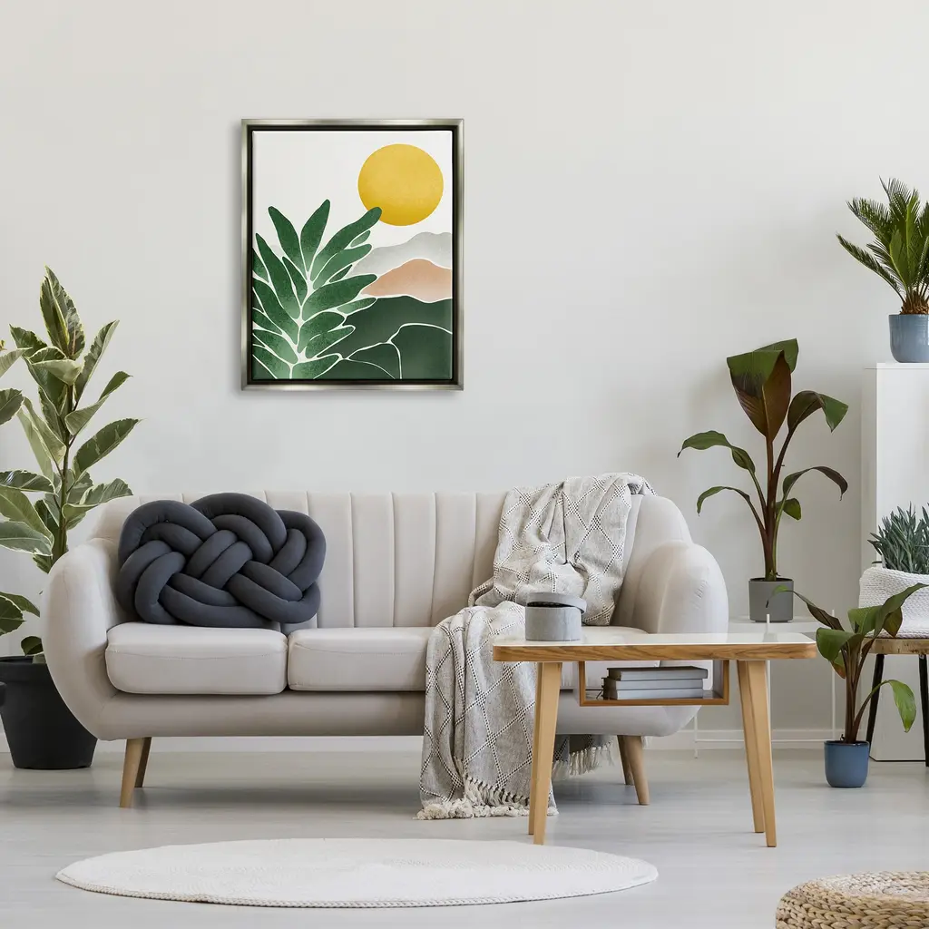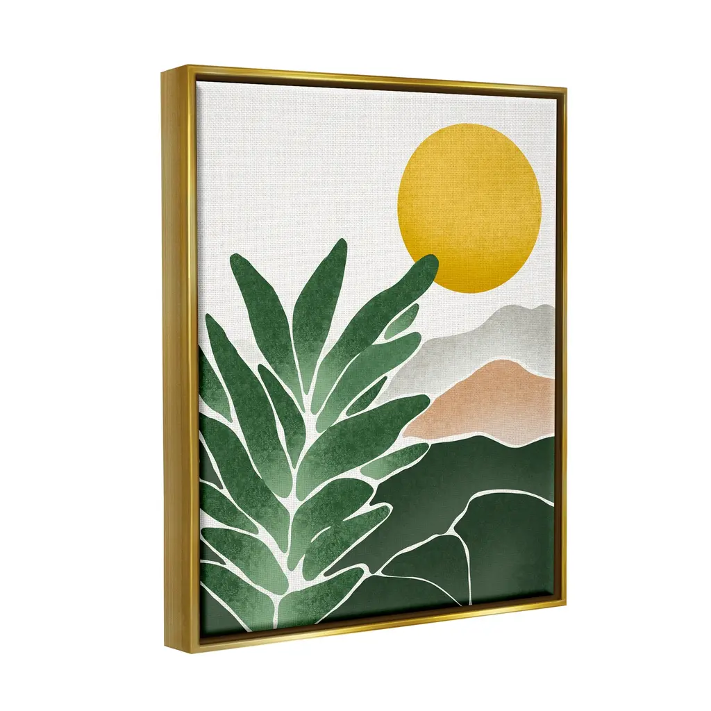 Elevate your home or office to the next level with Stupell Framed Floating Canvas Wall Art. Our premium hand-stretched canvas is mounted securely into a sturdy lightweight frame. The museum-style gap between the wrapped canvas and the box frame gives the illusion of floating artwork. Stupell Wall Art is made in the USA.Features: Dimensions: 17 x 1.7 x 21 Frame, 16 x 1.5 x 20 Canvas ArtFloating Frame Sizes Include Standard: 17 x 1.7 x 21 Oversized: 25 x 1.7 x 31Wall Art is Ready to Hang - No Installation or Hardware Needed. For Easy Set Up Lean or Layer Artwork on Shelf or Against Wall.Our elevated 1.7" Thick Floating Frame is the perfect complement to our canvas style Wall Art. We use only the highest quality inks in house with industry leading printing solutions. Canvas is hand stretched over a durable wood foundation and then mounted securly into a Modern Box Frame. Made in the USA.Artwork Relates To: Leaf, Plant, Vegetation, Sun, Hills, Mountain, Nature, Landscape, AbstractDesign by Ziwei Li