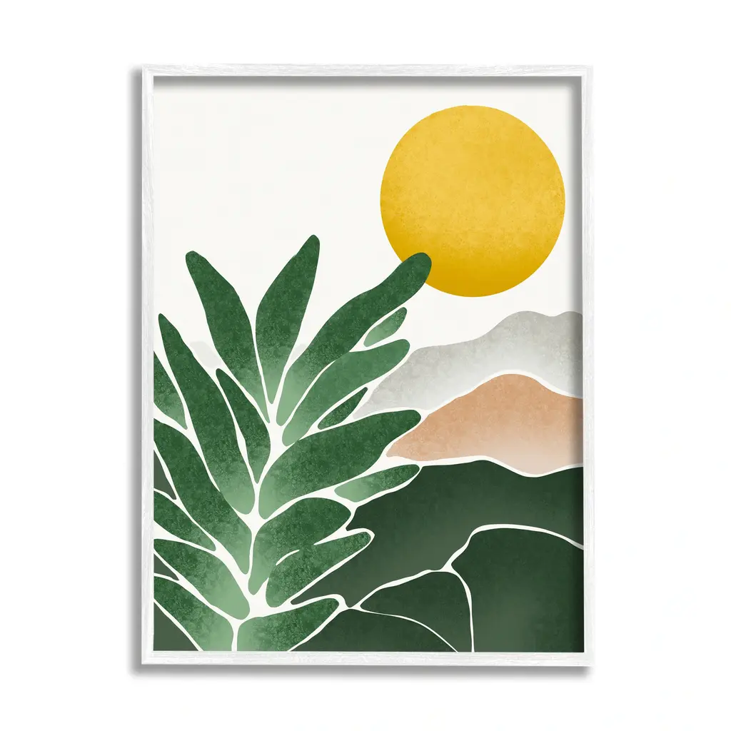 Add dimension to any room with our textured Framed Giclee Artwork. Our framed artwork is securely mounted into a 1.5-inch thick wood grain frame and ready to hang. Frames are available in three alluring styles: black, gray farmhouse and white. In addition, you should check out our oversized options if you want a statement piece. Stupell Wall Art is made in the USA.Features: Dimensions: 11 x 1.5 x 14 FramedFramed Giclee Sizes Include Standard: 11 x 1.5 x 14 Large: 16 x 1.5 x 20 Oversized: 24 x 1.5 x 30Wall Art is Ready to Hang - No Installation or Hardware Needed. For Easy Set Up Lean or Layer Artwork on Shelf or Against Wall.Our giclée prints are carefully mounted on a durable MDF backing, and then perfectly finished in a 1.5 inch thick woodgrain frame. Mounted frame colors include black, gray farmhouse and white. Made In USA.Artwork Relates To: Leaf, Plant, Vegetation, Sun, Hills, Mountain, Nature, Landscape, AbstractDesign by Ziwei Li