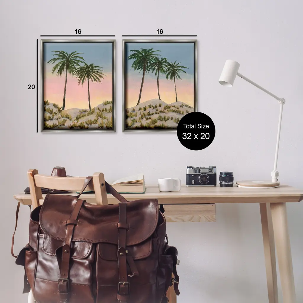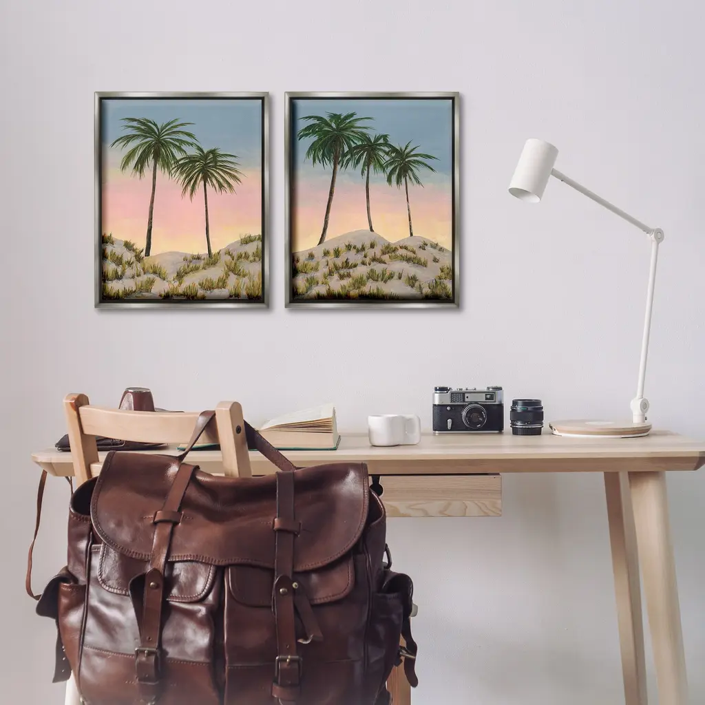 Elevate your home or office to the next level with Stupell Framed Floating Canvas Wall Art. Our premium hand-stretched canvas is mounted securely into a sturdy lightweight frame. The museum-style gap between the wrapped canvas and the box frame gives the illusion of floating artwork. Stupell Wall Art is made in the USA.Features: Dimensions: 2 Piece Set, Each Frame is 17 x 1.7 x 21Two Piece Floater Framed Canvas are available as 17x21 or 25x31 Panels. All Floater Frame Products have a 1.7" Depth.Wall Art is Ready to Hang with Hardware Free Hanging. No Installation required. For Easy Set Up Lean or Layer Artwork on Shelf or Against Wall. Artwork is Permently Fixed into the Frame.Our elevated 1.7" Thick Floating Frame is the perfect complement to our canvas style Wall Art. We use only the highest quality inks in house with industry leading printing solutions. Canvas is hand stretched over a durable wood foundation and then mounted securly into a Modern Box Frame. Made in the USA.Artwork Relates To: Plant, Tree, Palm Tree, Painting, Tropical, Beach, Sunset, Sunrise, SummerDesign by Michael Willett
