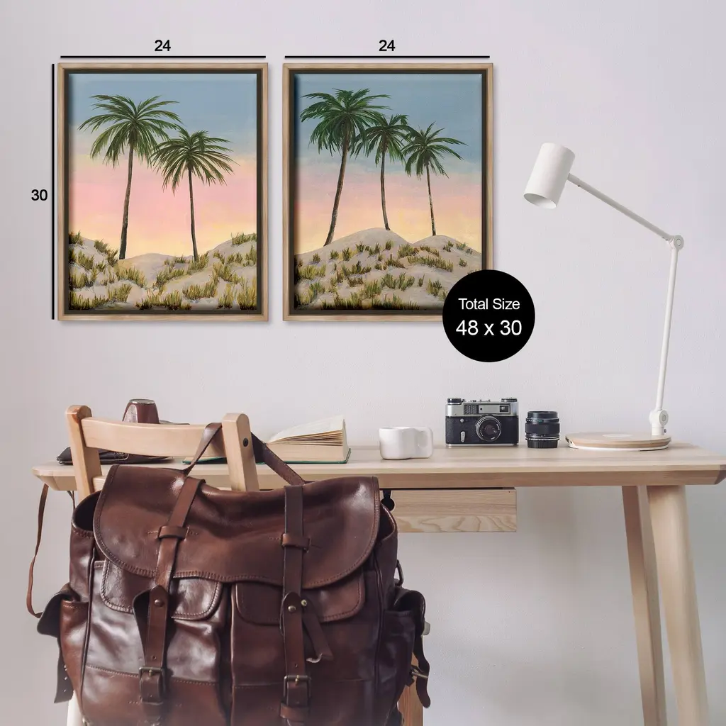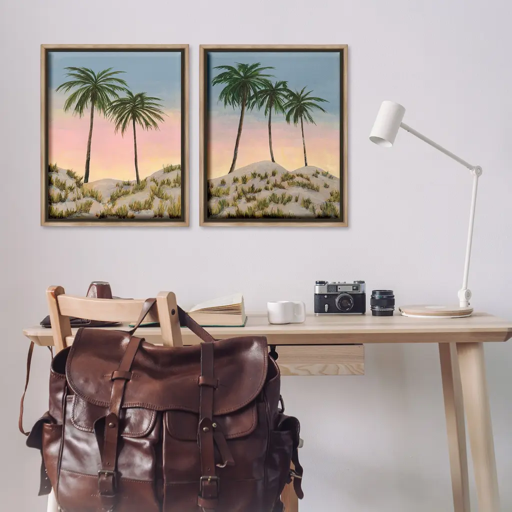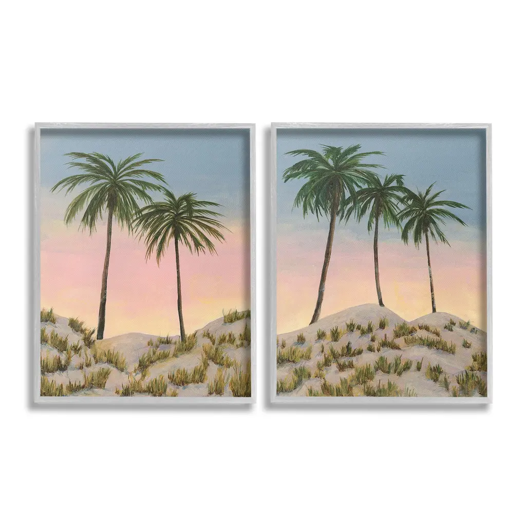 Elevate your home or office to the next level with Stupell Framed Floating Canvas Wall Art. Our premium hand-stretched canvas is mounted securely into a sturdy lightweight frame. The museum-style gap between the wrapped canvas and the box frame gives the illusion of floating artwork. Stupell Wall Art is made in the USA.Features: Dimensions: 2 Piece Set, Each Frame is 17 x 1.7 x 21Two Piece Floater Framed Canvas are available as 17x21 or 25x31 Panels. All Floater Frame Products have a 1.7" Depth.Wall Art is Ready to Hang with Hardware Free Hanging. No Installation required. For Easy Set Up Lean or Layer Artwork on Shelf or Against Wall. Artwork is Permently Fixed into the Frame.Our elevated 1.7" Thick Floating Frame is the perfect complement to our canvas style Wall Art. We use only the highest quality inks in house with industry leading printing solutions. Canvas is hand stretched over a durable wood foundation and then mounted securly into a Modern Box Frame. Made in the USA.Artwork Relates To: Plant, Tree, Palm Tree, Painting, Tropical, Beach, Sunset, Sunrise, SummerDesign by Michael Willett