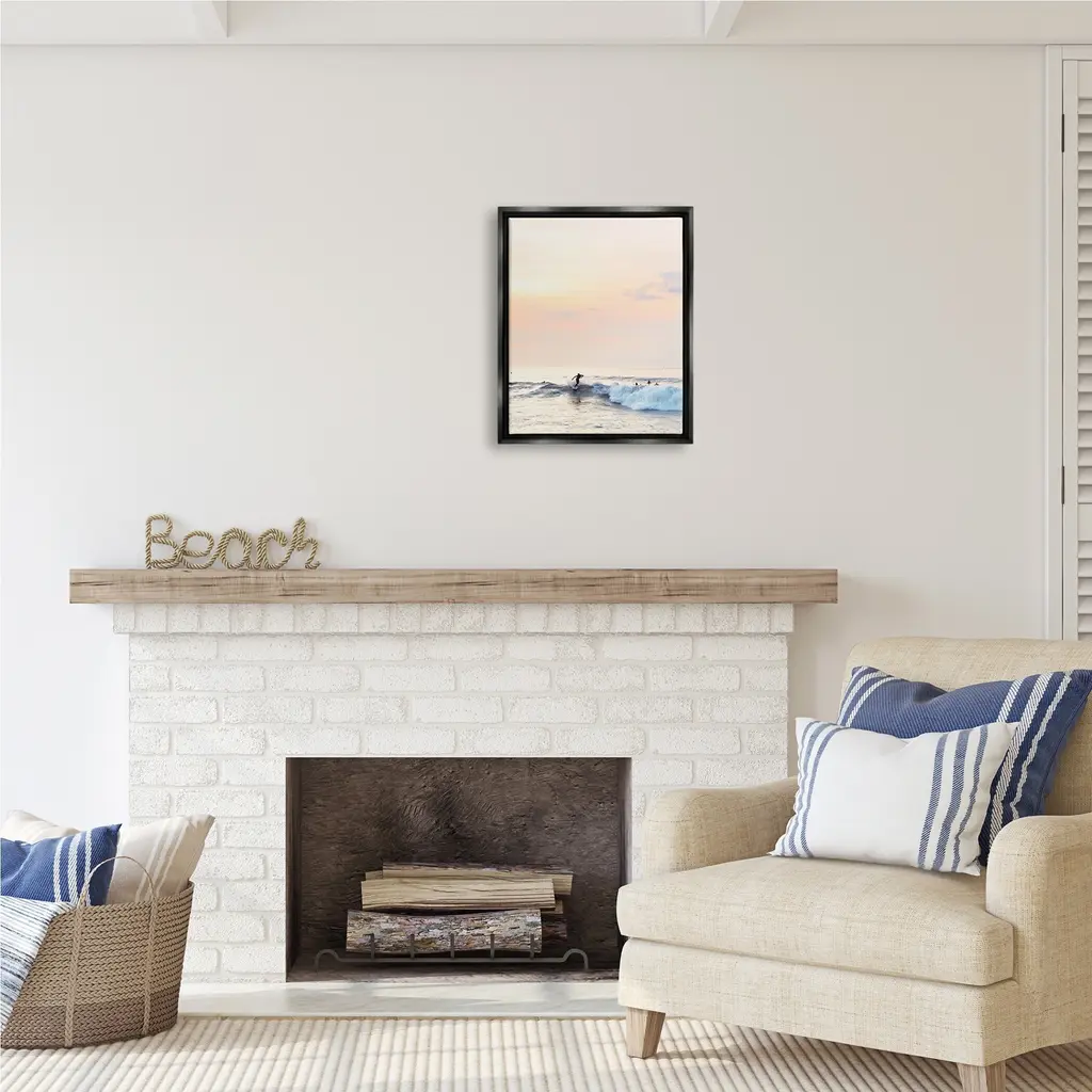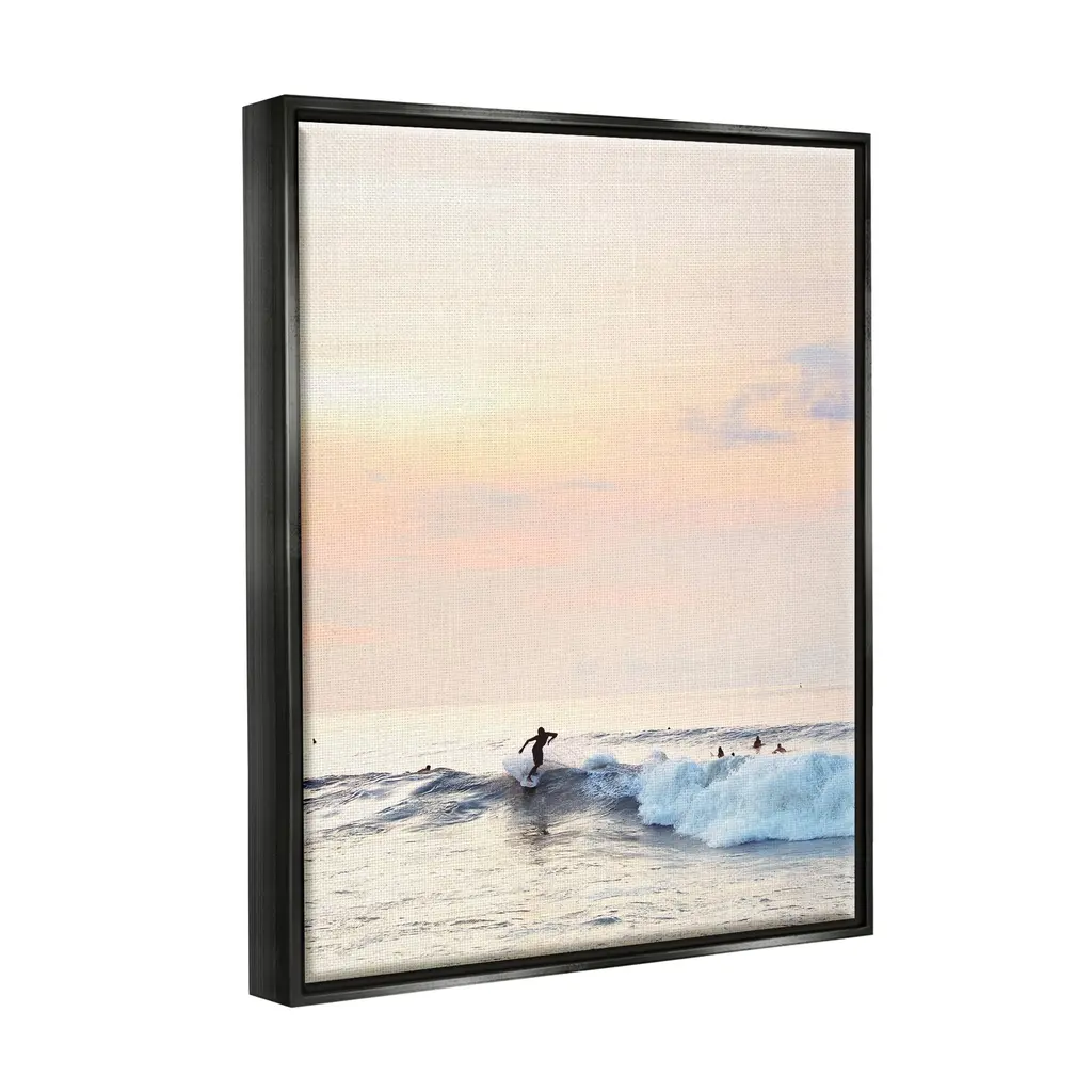 Elevate your home or office to the next level with Stupell Framed Floating Canvas Wall Art. Our premium hand-stretched canvas is mounted securely into a sturdy lightweight frame. The museum-style gap between the wrapped canvas and the box frame gives the illusion of floating artwork. Stupell Wall Art is made in the USA.Features: Dimensions: 17 x 1.7 x 21 Frame, 16 x 1.5 x 20 Canvas ArtFloating Frame Sizes Include Standard: 17 x 1.7 x 21 Oversized: 25 x 1.7 x 31Wall Art is Ready to Hang with Hardware Free Hanging. No installation required. For Easy Set Up Lean or Layer Artwork on Shelf or Against Wall.Our elevated 1.7" Thick Floating Frame is the perfect complement to our canvas style Wall Art. We use only the highest quality inks in house with industry leading printing solutions. Canvas is hand stretched over a durable wood foundation and then mounted securly into a Modern Box Frame. Made in the USA.Artwork Relates To: Sea, Water, Sea Waves, Sport, Surfing, Person, Horizon, Sky, Summer, Sunset, SunriseDesign by Sisi and Seb
