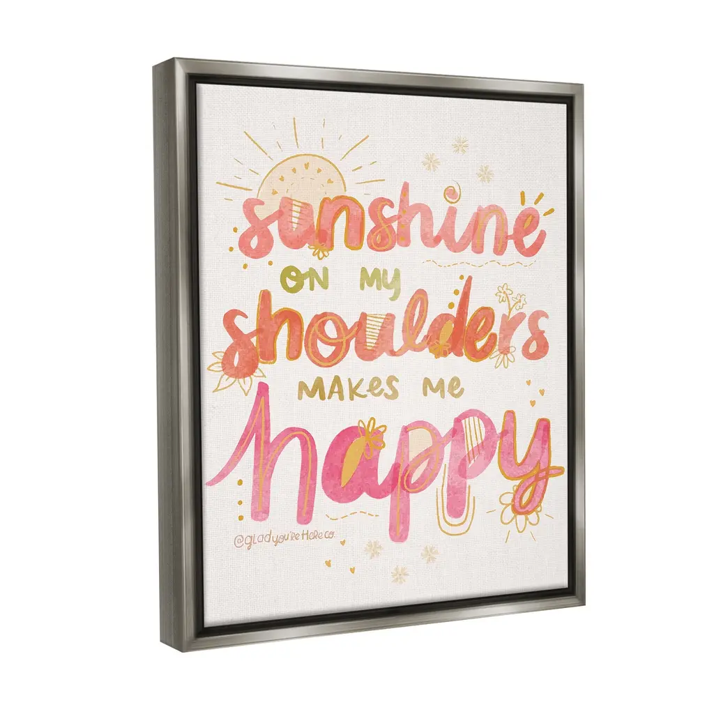 Elevate your home or office to the next level with Stupell Framed Floating Canvas Wall Art. Our premium hand-stretched canvas is mounted securely into a sturdy lightweight frame. The museum-style gap between the wrapped canvas and the box frame gives the illusion of floating artwork. Stupell Wall Art is made in the USA.Features: Dimensions: 17 x 1.7 x 21 Frame, 16 x 1.5 x 20 Canvas ArtFloating Frame Canvas Products are available in sizes 17"x21" and 25"x31". All Floating Frame Canvas Products have a 1.7" Depth.Wall Art is Ready to Hang with Hardware Free Hanging. No Installation required. For Easy Set Up Lean or Layer Artwork on Shelf or Against Wall. Artwork is Permently Fixed into the Frame.Our elevated 1.7" Thick Floating Frame is the perfect complement to our canvas style Wall Art. We use only the highest quality inks in house with industry leading printing solutions. Canvas is hand stretched over a durable wood foundation and then mounted securly into a Modern Box Frame. Made in the USA.Artwork Relates To: Nature, Sun, Beach, Summer, Floral, Pattern, Sunshine on My Shoulders Makes Me HappyDesign by Glad You're Here Co.