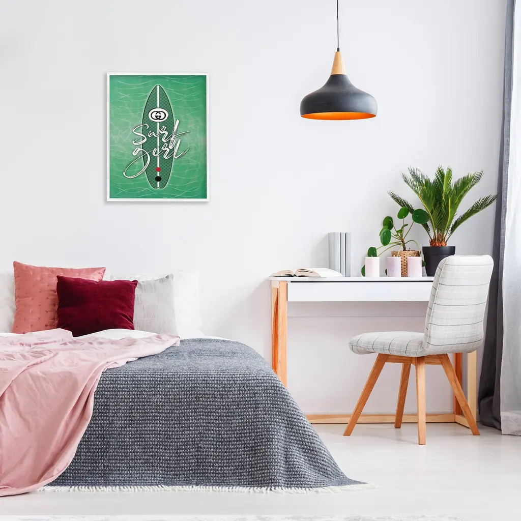 Add dimension to any room with our textured Framed Giclee Artwork. Our framed artwork is securely mounted into a 1.5-inch thick wood grain frame and ready to hang. Frames are available in three alluring styles: black, gray farmhouse and white. In addition, you should check out our oversized options if you want a statement piece. Stupell Wall Art is made in the USA.Features: Dimensions: 11 x 1.5 x 14 FramedFramed Giclee Products are available in the sizes 11"x14", 16"x20" or 24"x30". All Framed Giclee Products have a 1.5" Depth. Wall Art is Ready to Hang with Hardware Free Hanging. No installation required. For Easy Set Up Lean or Layer Artwork on Shelf or Against Wall.Our giclée prints are carefully mounted on a durable MDF backing, and then perfectly finished in a 1.5 inch thick woodgrain frame. Mounted frame colors include black, gray farmhouse and white. Made In USA.Artwork Relates To: Glam, Fashion, Pattern, Surf, Nautical, Surfboard, Logo, Surf GirlDesign by Martina Pavlova