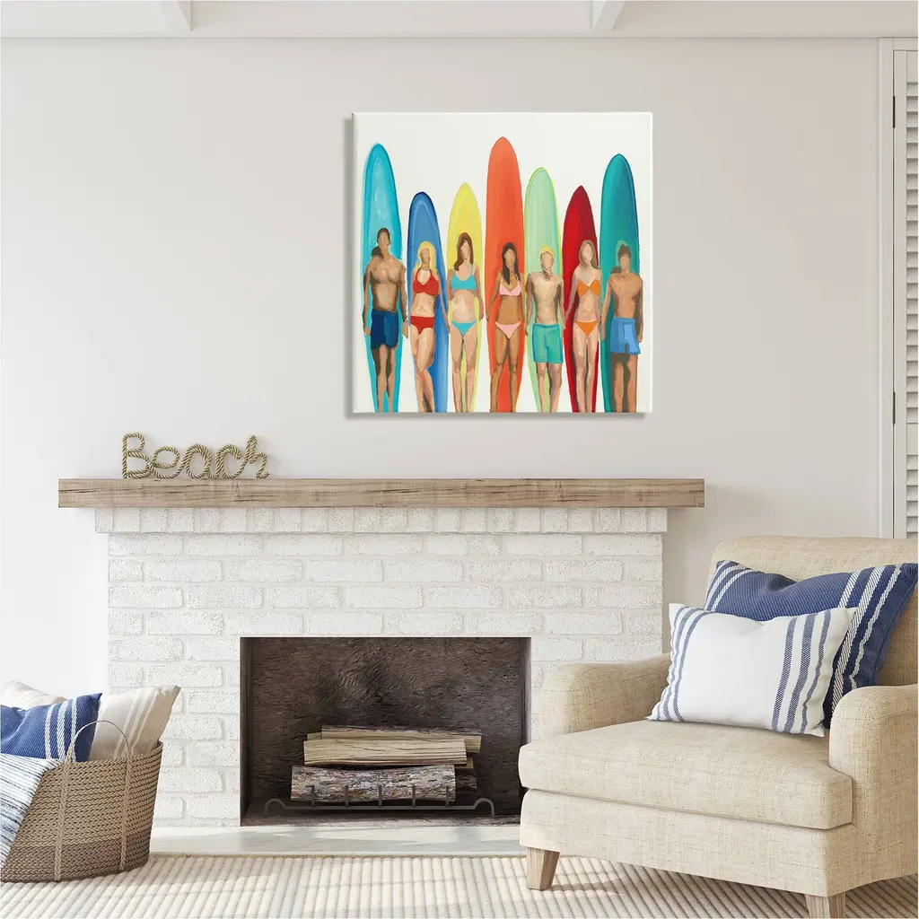 We create our stretched canvas to the highest standards. Using only the highest quality inks and canvas on Mimaki printers, we hand-cut and stretch each piece over a 1.5-inch thick wooden frame for hanging. As a result, the art comes ready to hang on the sturdy ledge with no installation required. Stupell Wall Art is made in the USA.Features: Dimensions: 17 x 1.5 x 17 InchesStretched Canvas Sizes Include Standard: 17 x 1.5 x 17 Large: 24 x 1.5 x 24 X-Large: 30 x 1.5 x 30 Oversized: 36 x 1.5 x 36Wall Art is Ready to Hang with Hardware Free Hanging. No installation required. For Easy Set Up Lean or Layer Artwork on Shelf or Against Wall.Our stretched canvas is created with the highest standards. We use only the highest quality inks and canvas on our in house Mimaki printers, and then hand cut and stretch each piece over a 1.5 inch thick wooden frame for hanging. Made In USA.Artwork Relates To: Sport, Surfing, Swimwear, Surfboard, PeopleDesign by Randy Hibberd