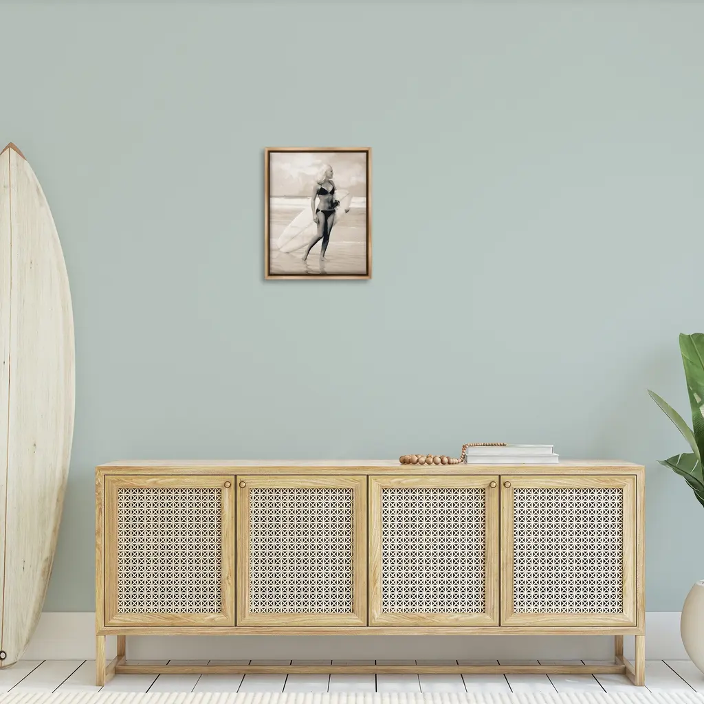 Elevate your home or office to the next level with Stupell Framed Floating Canvas Wall Art. Our premium hand-stretched canvas is mounted securely into a sturdy lightweight frame. The museum-style gap between the wrapped canvas and the box frame gives the illusion of floating artwork. Stupell Wall Art is made in the USA.Features: Dimensions: 17 x 1.7 x 21 Frame, 16 x 1.5 x 20 Canvas ArtFloating Frame Canvas Products are available in sizes 17"x21" and 25"x31". All Floating Frame Canvas Products have a 1.7" Depth.Wall Art is Ready to Hang with Hardware Free Hanging. No Installation required. For Easy Set Up Lean or Layer Artwork on Shelf or Against Wall. Artwork is Permently Fixed into the Frame.Our elevated 1.7" Thick Floating Frame is the perfect complement to our canvas style Wall Art. We use only the highest quality inks in house with industry leading printing solutions. Canvas is hand stretched over a durable wood foundation and then mounted securly into a Modern Box Frame. Made in the USA.Artwork Relates To: Sea, Water, Swimsuit, Sea Waves, Bikini, Person, Woman, Sport, Surfing, Beach, Coast, ShorelineDesign by GraffiTee Studios