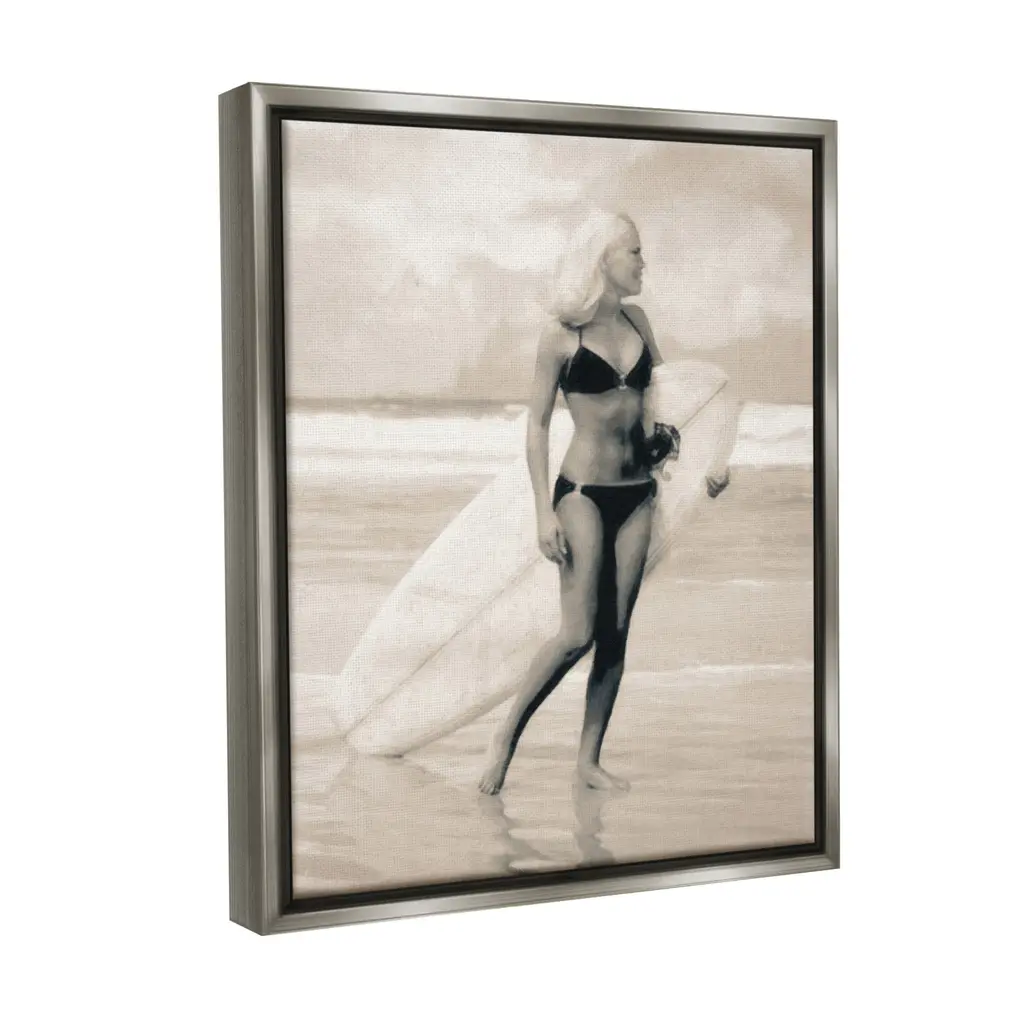 Elevate your home or office to the next level with Stupell Framed Floating Canvas Wall Art. Our premium hand-stretched canvas is mounted securely into a sturdy lightweight frame. The museum-style gap between the wrapped canvas and the box frame gives the illusion of floating artwork. Stupell Wall Art is made in the USA.Features: Dimensions: 17 x 1.7 x 21 Frame, 16 x 1.5 x 20 Canvas ArtFloating Frame Canvas Products are available in sizes 17"x21" and 25"x31". All Floating Frame Canvas Products have a 1.7" Depth.Wall Art is Ready to Hang with Hardware Free Hanging. No Installation required. For Easy Set Up Lean or Layer Artwork on Shelf or Against Wall. Artwork is Permently Fixed into the Frame.Our elevated 1.7" Thick Floating Frame is the perfect complement to our canvas style Wall Art. We use only the highest quality inks in house with industry leading printing solutions. Canvas is hand stretched over a durable wood foundation and then mounted securly into a Modern Box Frame. Made in the USA.Artwork Relates To: Sea, Water, Swimsuit, Sea Waves, Bikini, Person, Woman, Sport, Surfing, Beach, Coast, ShorelineDesign by GraffiTee Studios