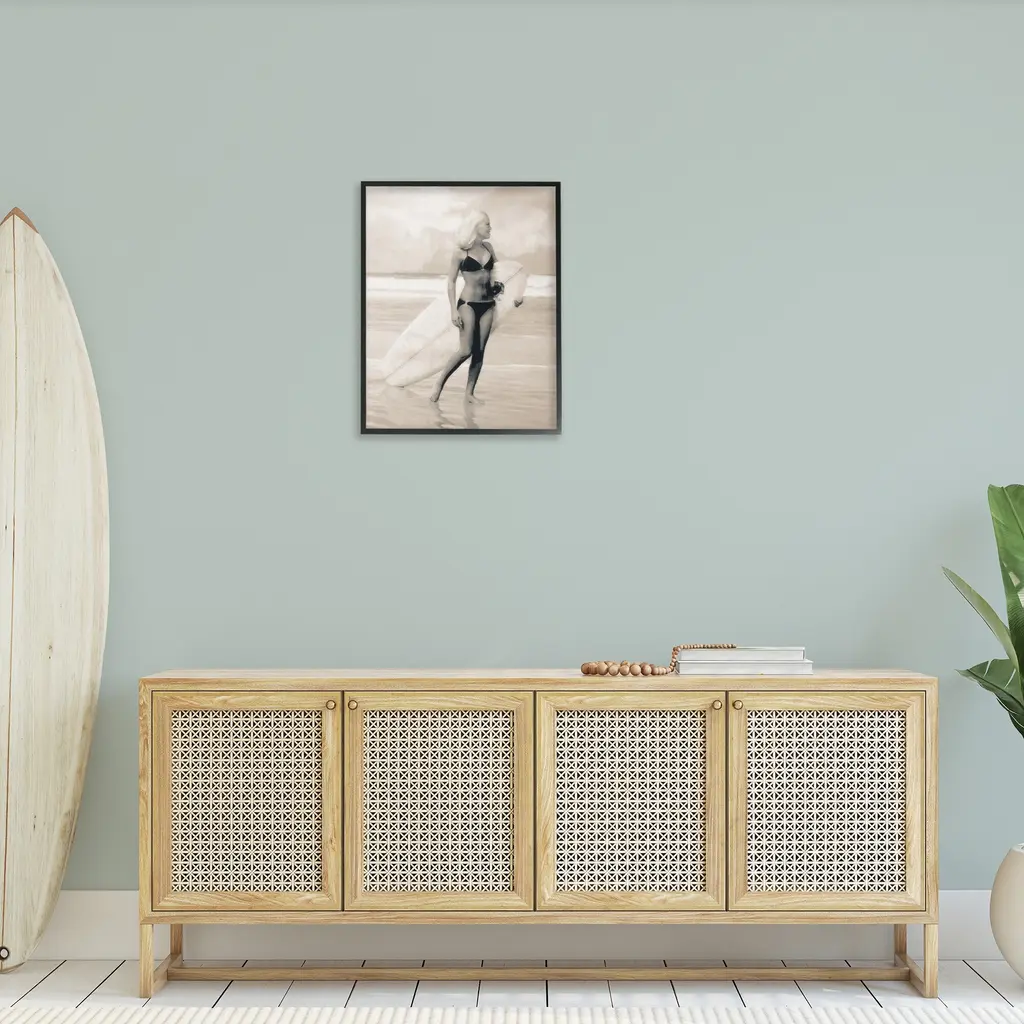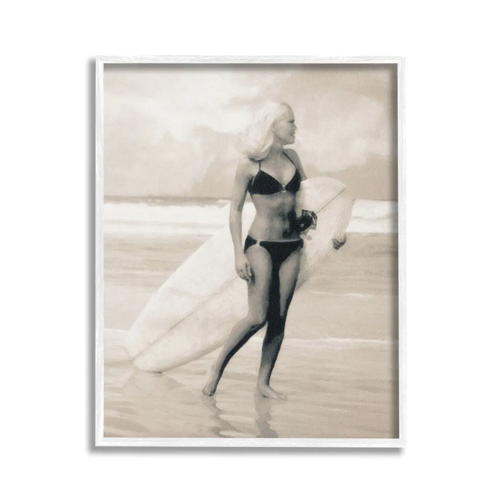 Add dimension to any room with our textured Framed Giclee Artwork. Our framed artwork is securely mounted into a 1.5-inch thick wood grain frame and ready to hang. Frames are available in three alluring styles: black, gray farmhouse and white. In addition, you should check out our oversized options if you want a statement piece. Stupell Wall Art is made in the USA.Features: Dimensions: 11 x 1.5 x 14 FramedFramed Giclee Products are available in the sizes 11"x14", 16"x20" or 24"x30". All Framed Giclee Products have a 1.5" Depth. Wall Art is Ready to Hang with Hardware Free Hanging. No installation required. For Easy Set Up Lean or Layer Artwork on Shelf or Against Wall.Our giclée prints are carefully mounted on a durable MDF backing, and then perfectly finished in a 1.5 inch thick woodgrain frame. Mounted frame colors include black, gray farmhouse and white. Made In USA.Artwork Relates To: Sea, Water, Swimsuit, Sea Waves, Bikini, Person, Woman, Sport, Surfing, Beach, Coast, ShorelineDesign by GraffiTee Studios