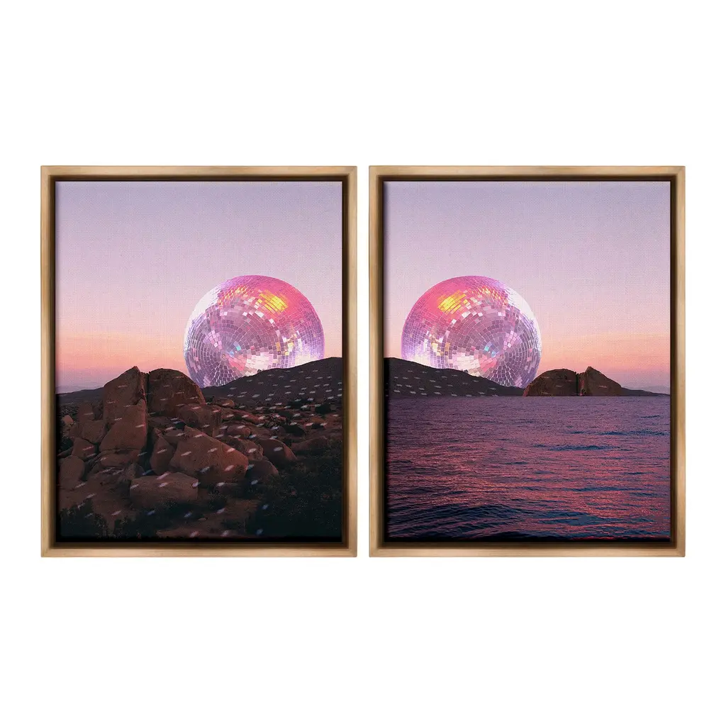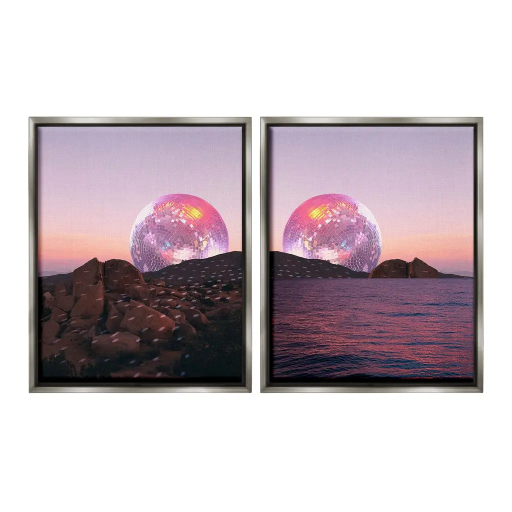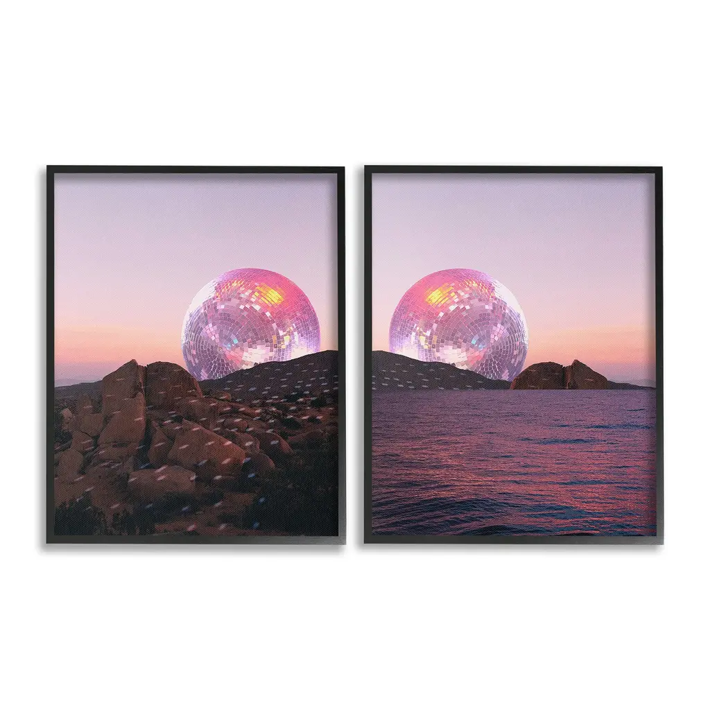 Fill any space in your home or office with our Framed Wall Art Sets. Our framed artwork is securely mounted into a 1.5-inch thick wood grain frame and ready to hang. Frames are available in three alluring styles: black, gray farmhouse and white. Stupell Wall Art is made in the USA.Features: Dimensions: 2 Piece Set, Each Panel is 11 x 1.5 x 14 FramedTwo Piece Framed Giclee Sets are available as 11"x14", 16"x20" or 24"x30" Panels. All Framed Giclee Products have a 1.5" Depth.Wall Art is Ready to Hang with Hardware Free Hanging. No installation required. For Easy Set Up Lean or Layer Artwork on Shelf or Against Wall.Curated Wall Art Sets make it easy for you complete the theme for any room. Our giclée prints are carefully mounted on a durable MDF backing, and then perfectly finished in a 1.5 inch thick woodgrain frame. Mounted frame colors include black, gray farmhouse and white. Made In USA.Artwork Relates To: Sphere, Nature, Rock, Sky, Moon, Disco Ball, Music, Dance, Surreal, Modern, Abstract, Water, Sea, Beach, OceanDesign by Lil' Rue