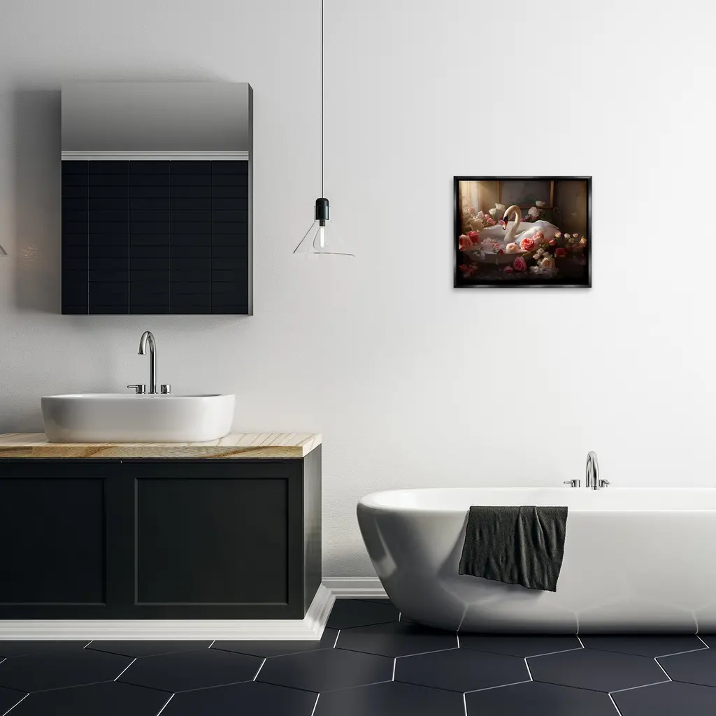 Stupell Swan & Bathroom Roses Framed Floater Canvas Wall Art Design By Lazar Studio - 21 X 17 - Black