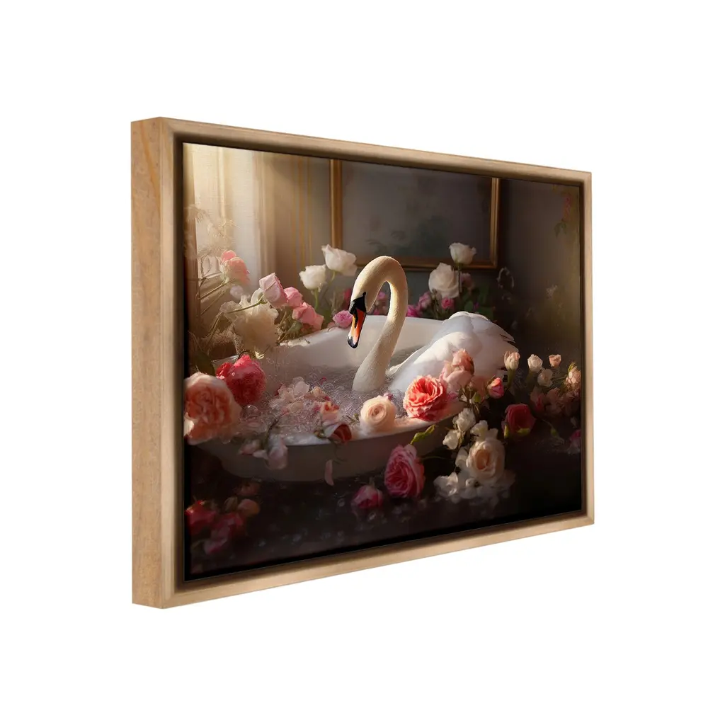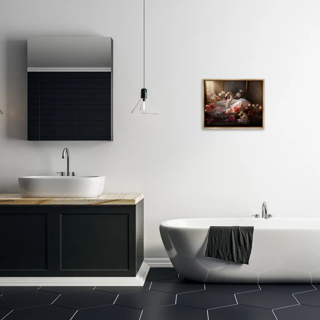 Elevate your home or office to the next level with Stupell Framed Floating Canvas Wall Art. Our premium hand-stretched canvas is mounted securely into a sturdy lightweight frame. The museum-style gap between the wrapped canvas and the box frame gives the illusion of floating artwork. Stupell Wall Art is made in the USA.Features: Dimensions: 21 x 1.7 x 17 Frame, 20 x 1.5 x 16 Canvas ArtFloating Frame Canvas Products are available in sizes 21"x17" and 31"x25". All Floating Frame Canvas Products have a 1.7" Depth.Wall Art is Ready to Hang with Hardware Free Hanging. No Installation required. For Easy Set Up Lean or Layer Artwork on Shelf or Against Wall. Artwork is Permently Fixed into the Frame.Our elevated 1.7" Thick Floating Frame is the perfect complement to our canvas style Wall Art. We use only the highest quality inks in house with industry leading printing solutions. Canvas is hand stretched over a durable wood foundation and then mounted securly into a Modern Box Frame. Made in the USA.Artwork Relates To: Bathroom, Animal, Tub, Flower, Blossom, Bird, Swan, RosesDesign by Lazar Studio