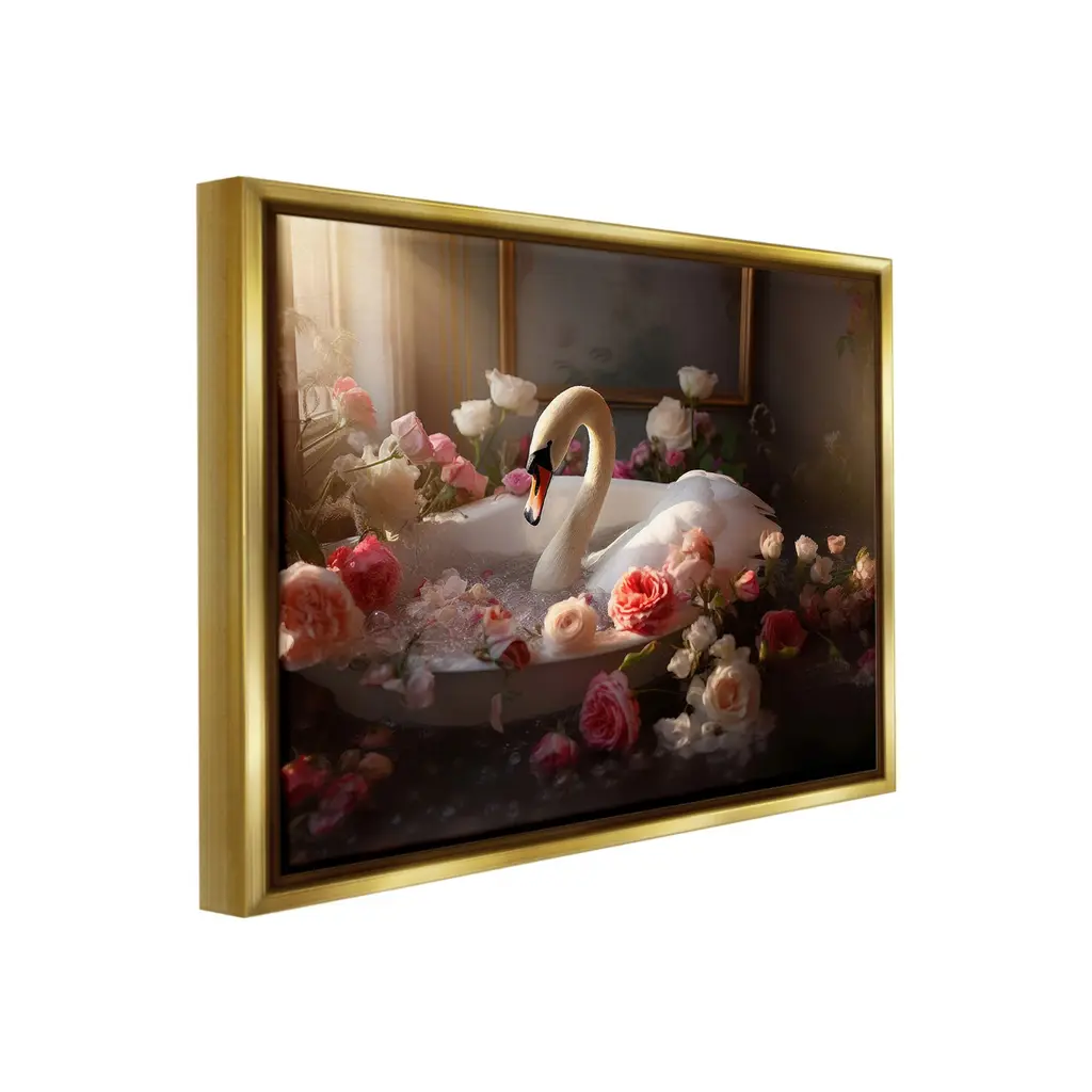 Elevate your home or office to the next level with Stupell Framed Floating Canvas Wall Art. Our premium hand-stretched canvas is mounted securely into a sturdy lightweight frame. The museum-style gap between the wrapped canvas and the box frame gives the illusion of floating artwork. Stupell Wall Art is made in the USA.Features: Dimensions: 21 x 1.7 x 17 Frame, 20 x 1.5 x 16 Canvas ArtFloating Frame Canvas Products are available in sizes 21"x17" and 31"x25". All Floating Frame Canvas Products have a 1.7" Depth.Wall Art is Ready to Hang with Hardware Free Hanging. No Installation required. For Easy Set Up Lean or Layer Artwork on Shelf or Against Wall. Artwork is Permently Fixed into the Frame.Our elevated 1.7" Thick Floating Frame is the perfect complement to our canvas style Wall Art. We use only the highest quality inks in house with industry leading printing solutions. Canvas is hand stretched over a durable wood foundation and then mounted securly into a Modern Box Frame. Made in the USA.Artwork Relates To: Bathroom, Animal, Tub, Flower, Blossom, Bird, Swan, RosesDesign by Lazar Studio